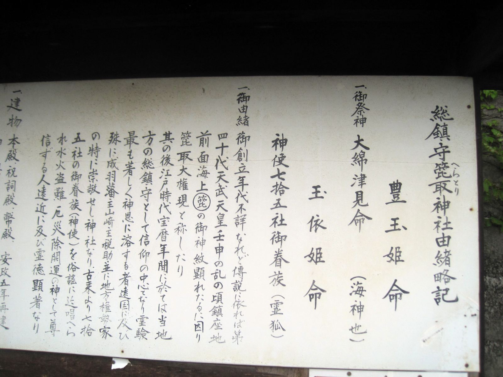 【箆取神社は水島地域西部の連島町大平山の中腹にある神社である。創建年代は不詳であるが、連島は奈良時代には都羅之郷と称し、壬申の乱の頃に神官が神社のあった場所から南に広がる瀬戸内海を眺めていた時、海面に「箆」の神紋が顕れたことから箆取大権現と称したと云われている。江戸時代初期までは,連島は瀬戸内海に浮かぶ孤島で、都から九州の大宰府を結ぶ海路で重要な位置を占めていたことにより海にまつわる伝承が多い。また、宝暦の頃には連島の総鎮守として信仰を集め、広い境内には長い廻廊が左右に巡らされている。周辺には桜、楓、ツツジが数百本植裁され、四季の変化が楽しめ、絵馬殿からの眺めは手前から西之浦の旧市街、水島市街と水島臨海工業地帯、遠方に水島灘と高梁川が臨める観光地ともなっている。なお、当社は崇敬神社につき氏子を持たない。祭神:豊玉姫命、大綿津見命(海神也)、玉依姫命、神使七十五社眷族(霊狐)が祀られている。】とのことです。