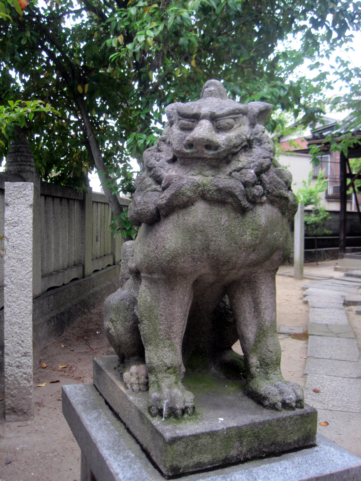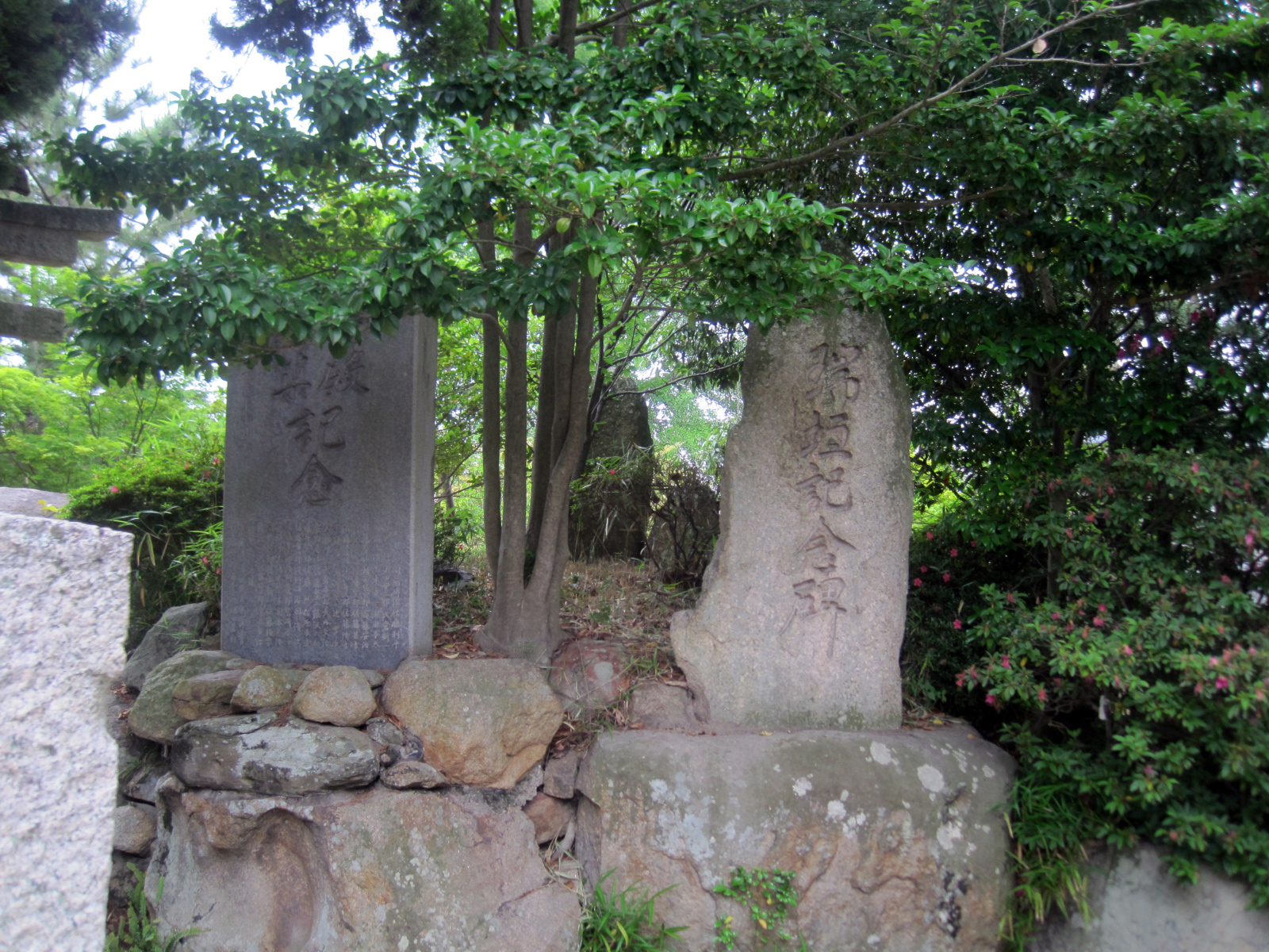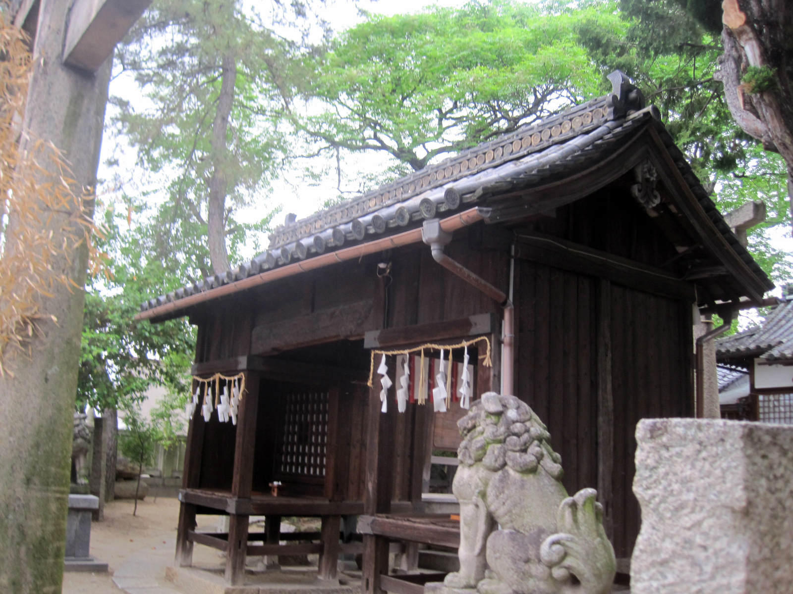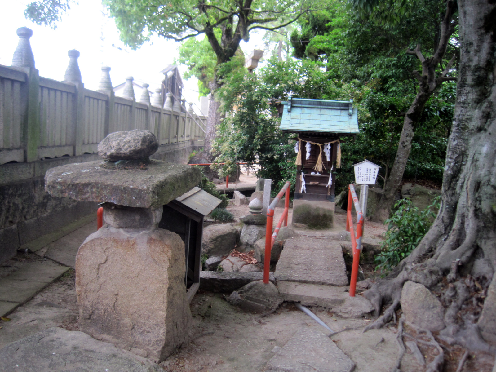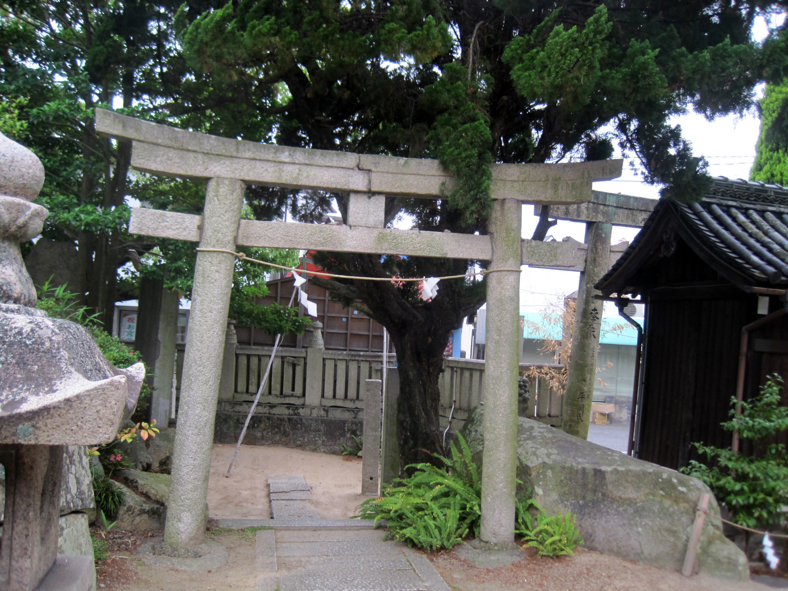 【由緒:御祭神の吉備津彦命は第七代孝霊天皇の皇子で第十代崇神天皇の御代に四道将軍の一人として吉備の国に下されこの国を平定された。その後、仁徳天皇が吉備地方に行幸になった時、吉備津神社を建立し命を祀った。当社は、吉備津神社の摂末社七十二社の一社であり妹尾西磯の鎮守社として祀ったものである。創建は定かではないが、当社燈籠に「開闢(かいびゃく)神亀三年春三月」とあり、聖武天皇の御代約千三百年前にはこの地に社殿が建立されていたことがうかがえる。また伝説によれば、吉備津彦命は汗入の沖で賊将梟帥(たける)をせいばいしたとき大風により船が転覆しそうになったが大亀に助けられた。やがてその磯の前の三つの小島に住吉三神を祀り、汗入の浜に豊玉彦命・豊玉比売命を祀った。その後現在の地に社殿を建立し吉備津彦命を祀ったとされている。現在でも、三つの小島の証として、境内には波に洗われた大岩・土中には多くの貝が現存する。】だそうです。