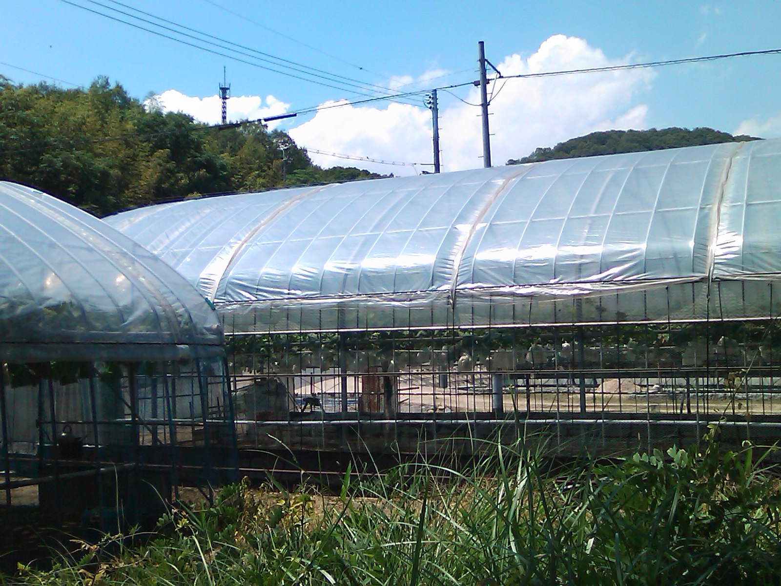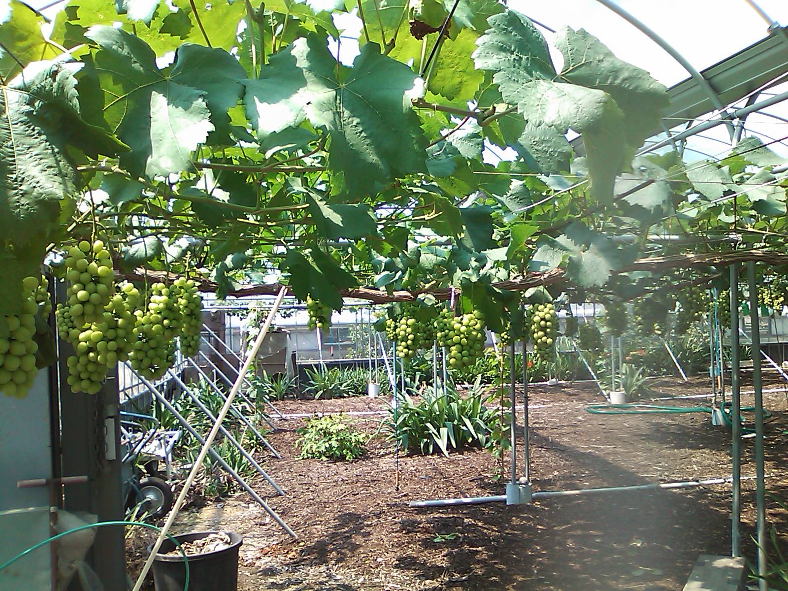 この栽培中の桃太郎マスカットは,種無しで,美味(だそうです)。