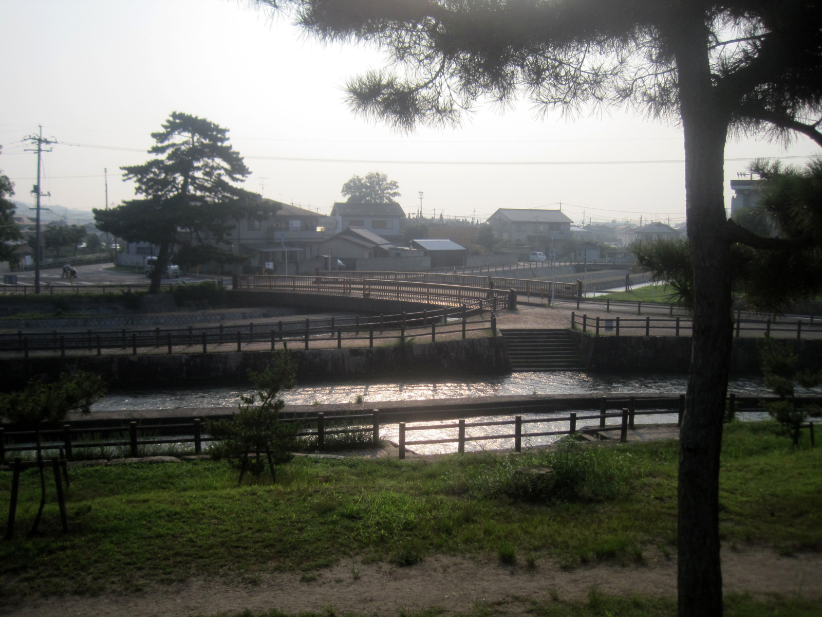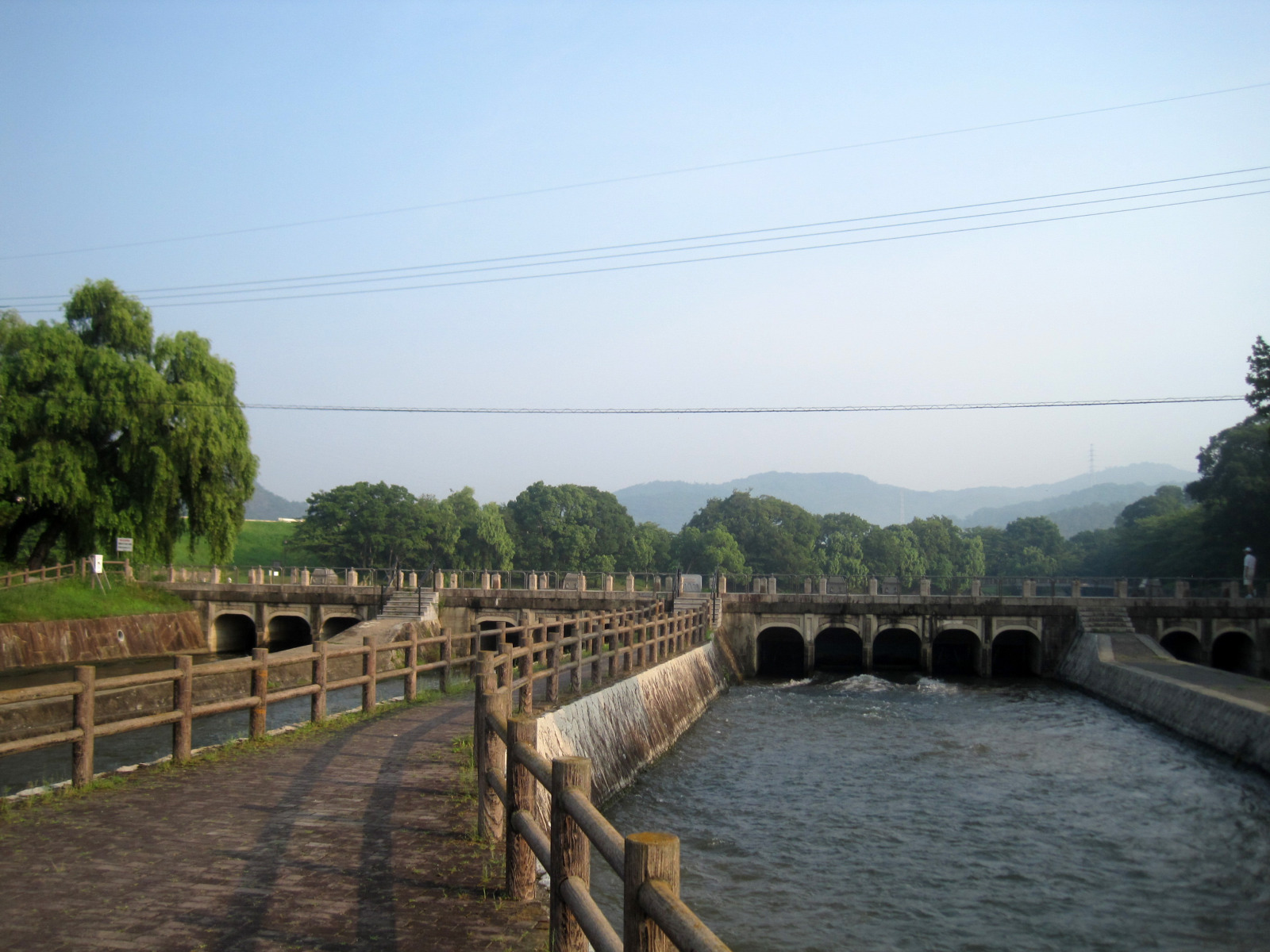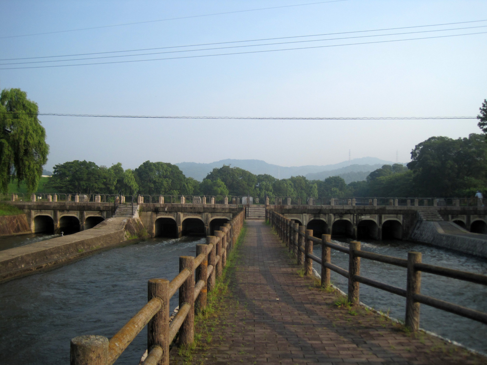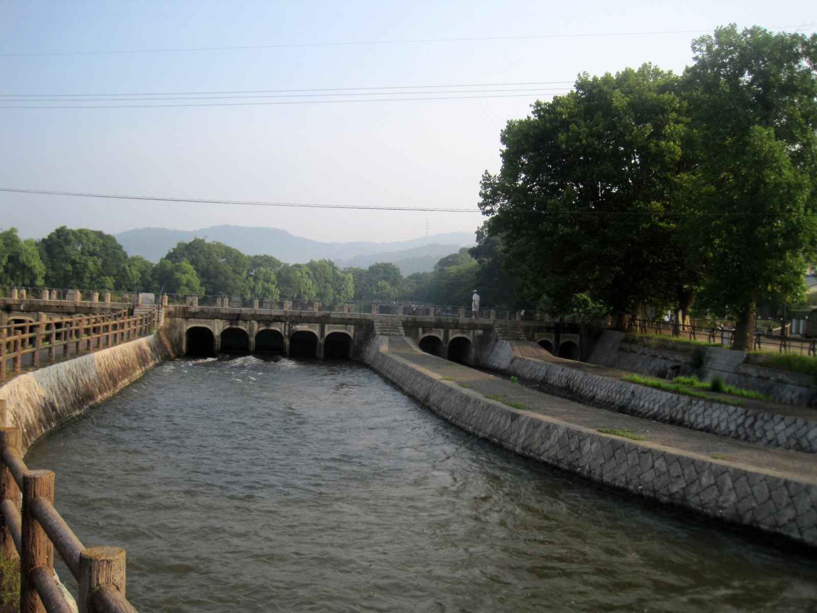 一番左は倉敷駅の西から美観地区で倉敷川に。真ん中の配水はどんどん枝分かれして,旧倉敷市街地西側全域に広がった後,種松山の東で吉岡川に集合して茶屋町で倉敷川に行くメインと,大平山と種松山の谷間から水島地区に広がって八間川にいたる農業用水に。さらに西側(この公園での水遊びのメインの流れ)は,高梁川と並走しながら西阿知地区や,大平山の西を抜けて連島地区を潤しながら高梁川河口付近(JFEのあたり)で貯水池になっています。倉敷水島の干拓の歴史ですよね!