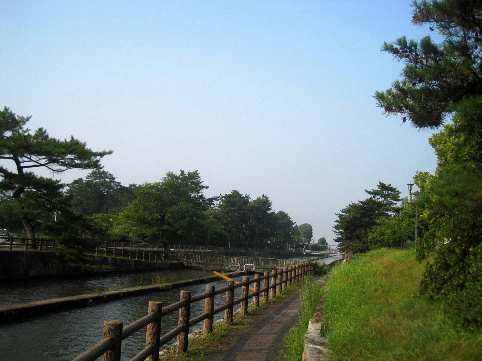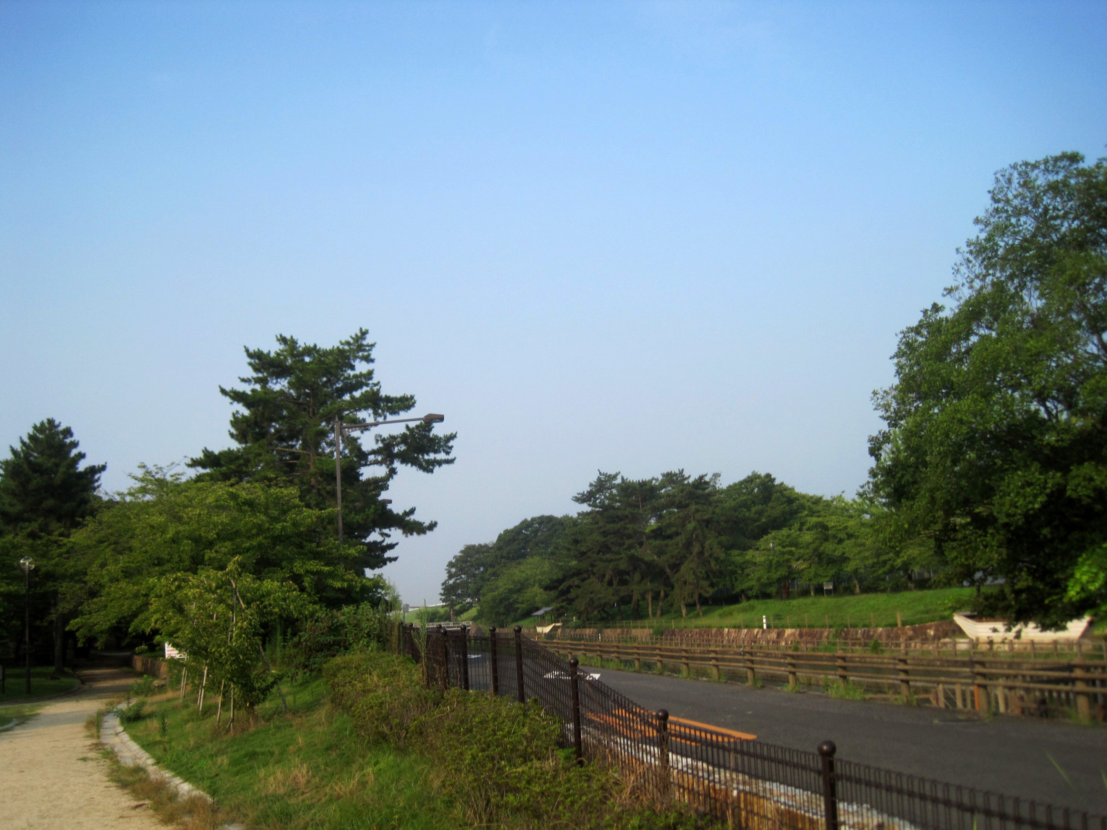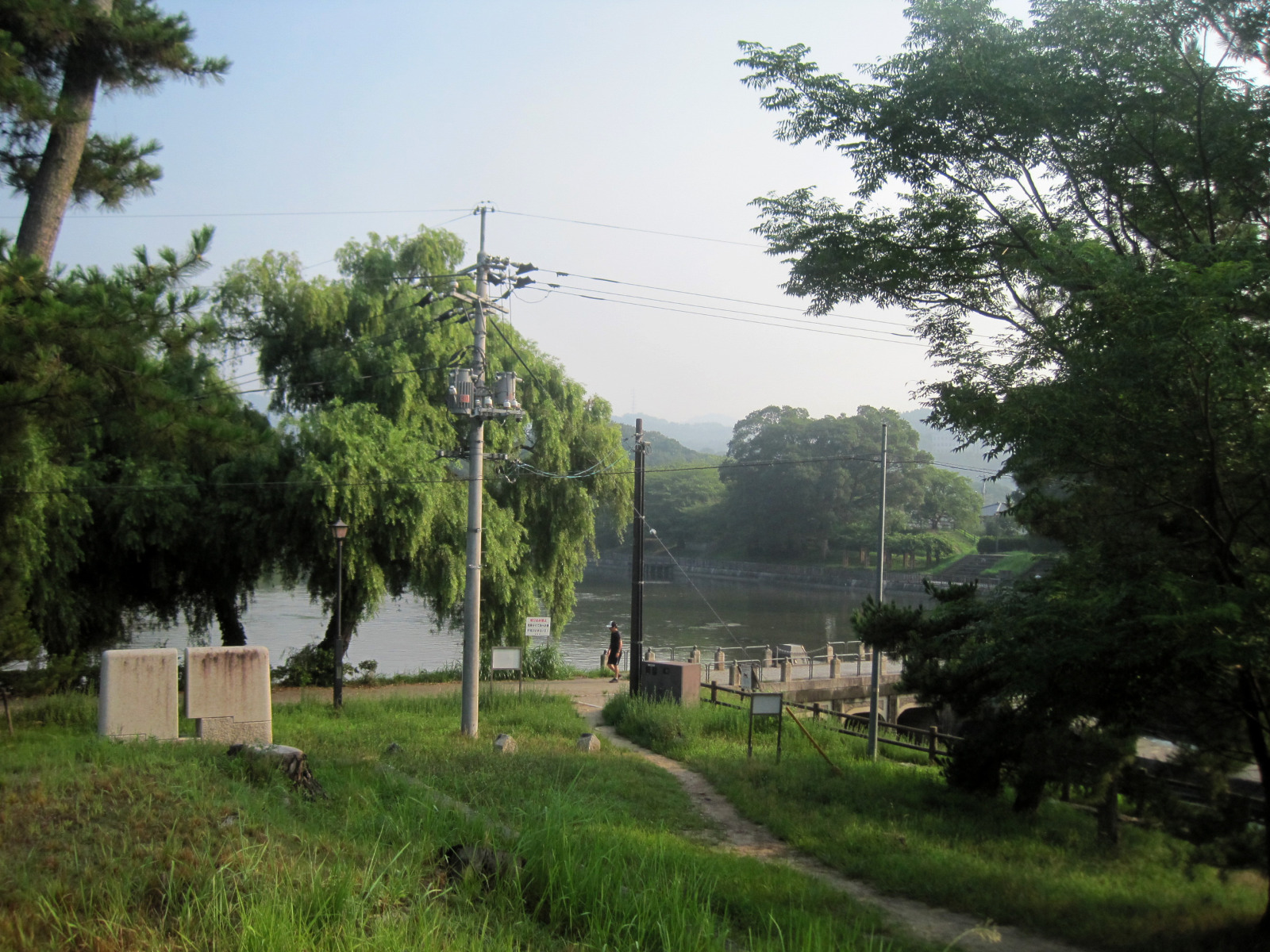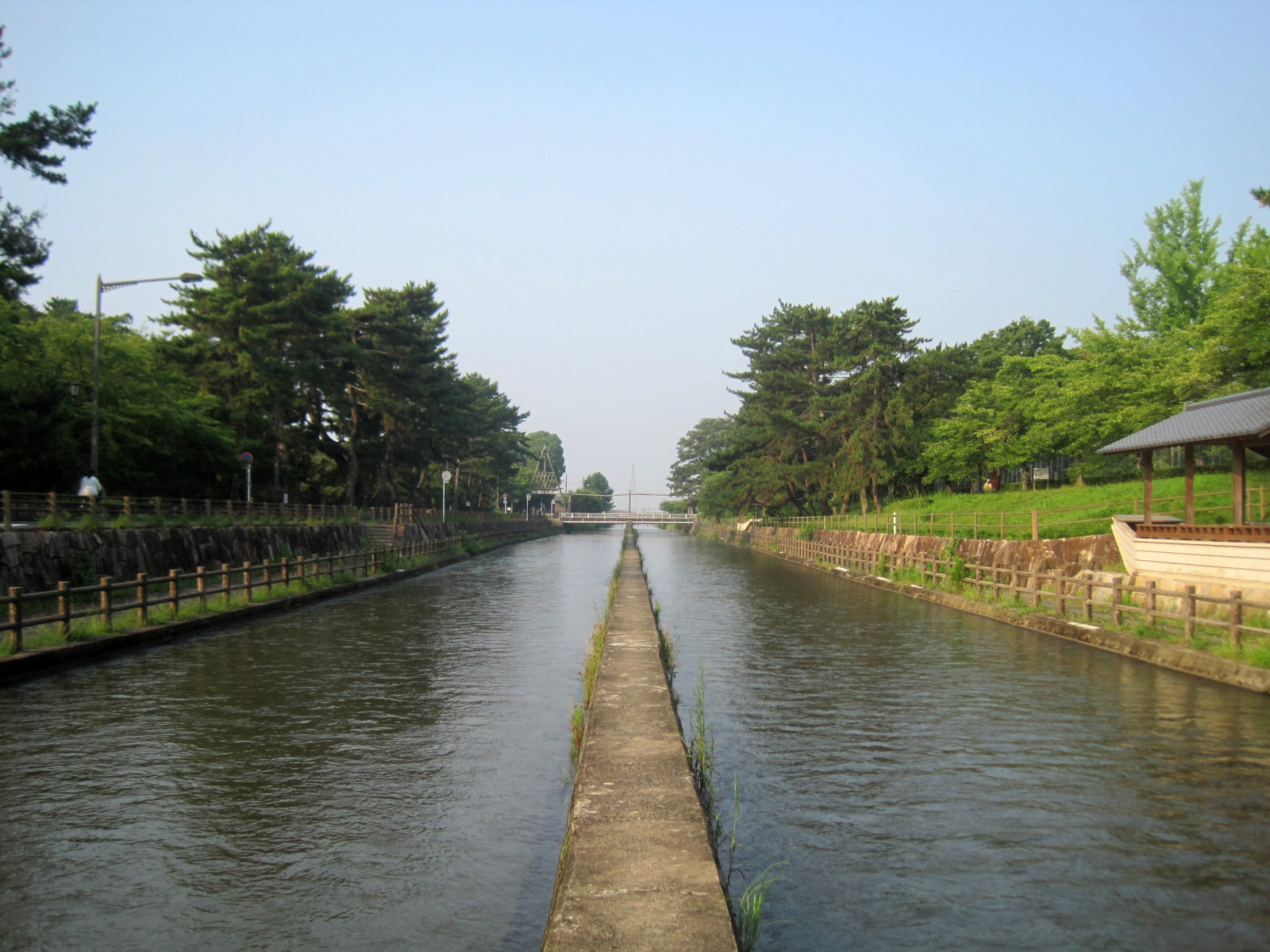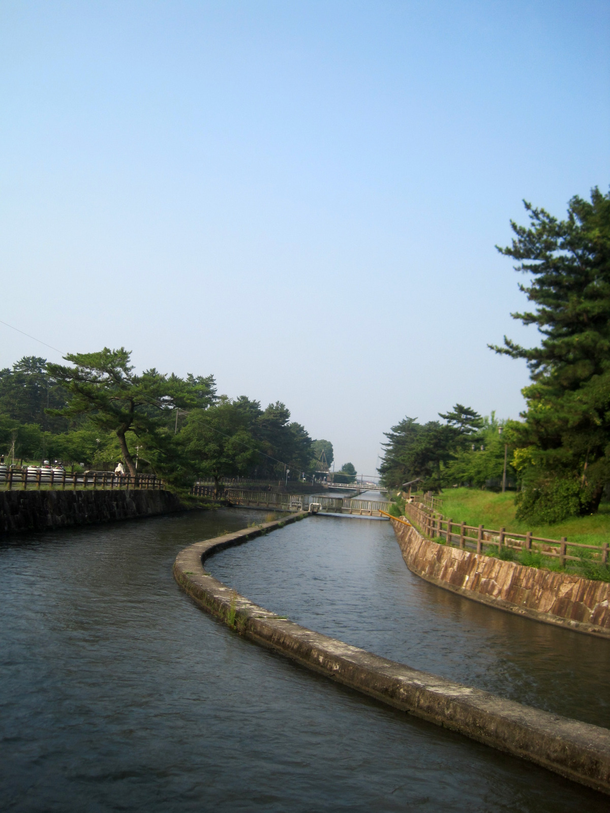 一番左は倉敷駅の西から美観地区で倉敷川に。真ん中の配水はどんどん枝分かれして,旧倉敷市街地西側全域に広がった後,種松山の東で吉岡川に集合して茶屋町で倉敷川に行くメインと,大平山と種松山の谷間から水島地区に広がって八間川にいたる農業用水に。さらに西側(この公園での水遊びのメインの流れ)は,高梁川と並走しながら西阿知地区や,大平山の西を抜けて連島地区を潤しながら高梁川河口付近(JFEのあたり)で貯水池になっています。倉敷水島の干拓の歴史ですよね!