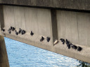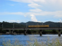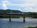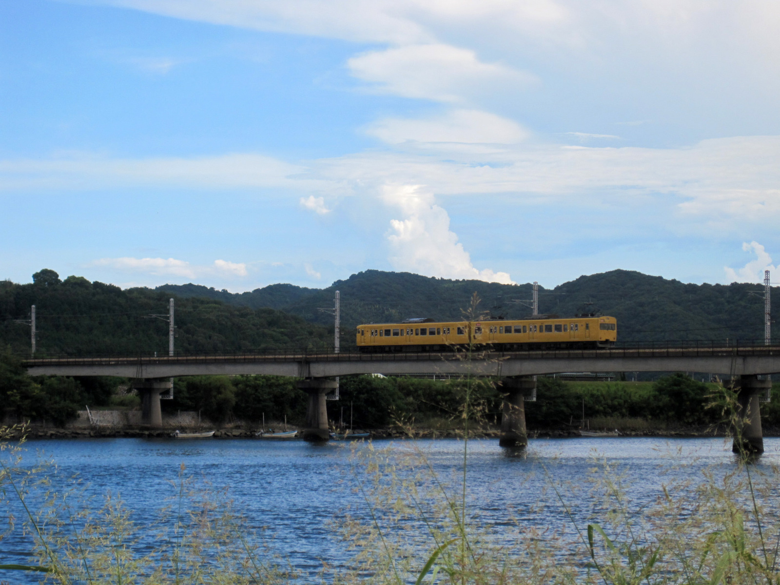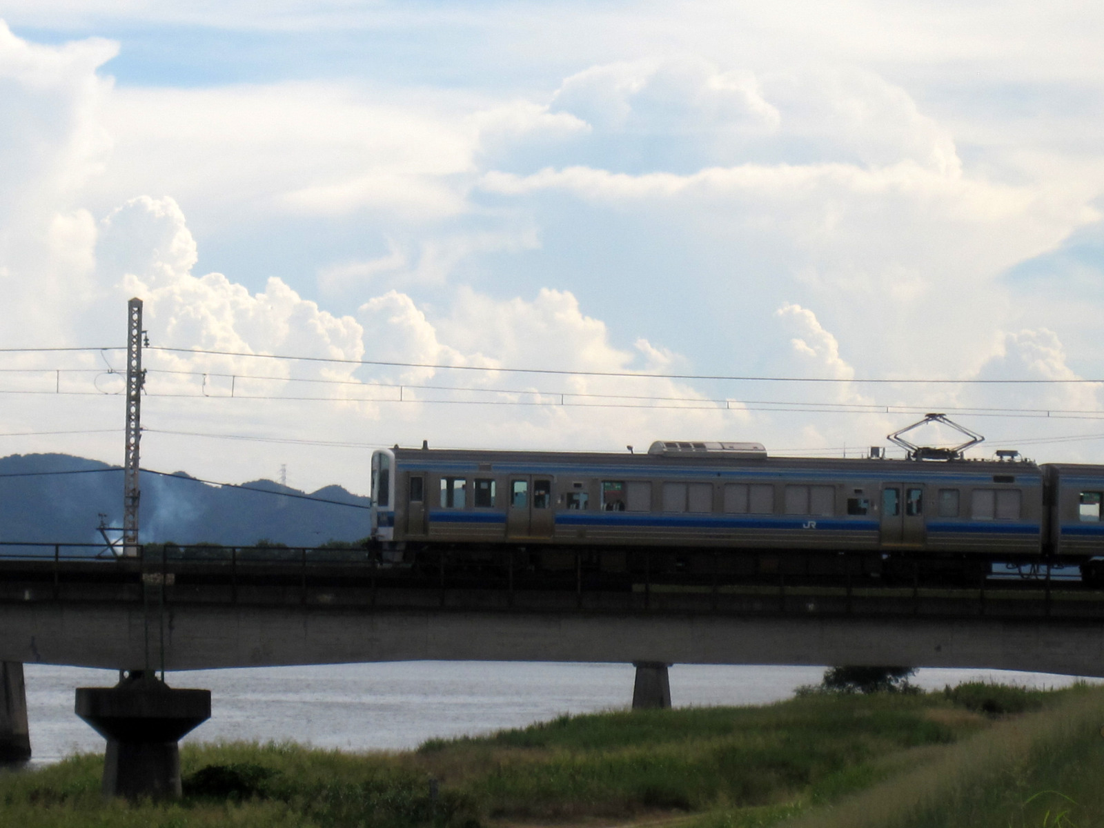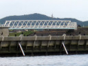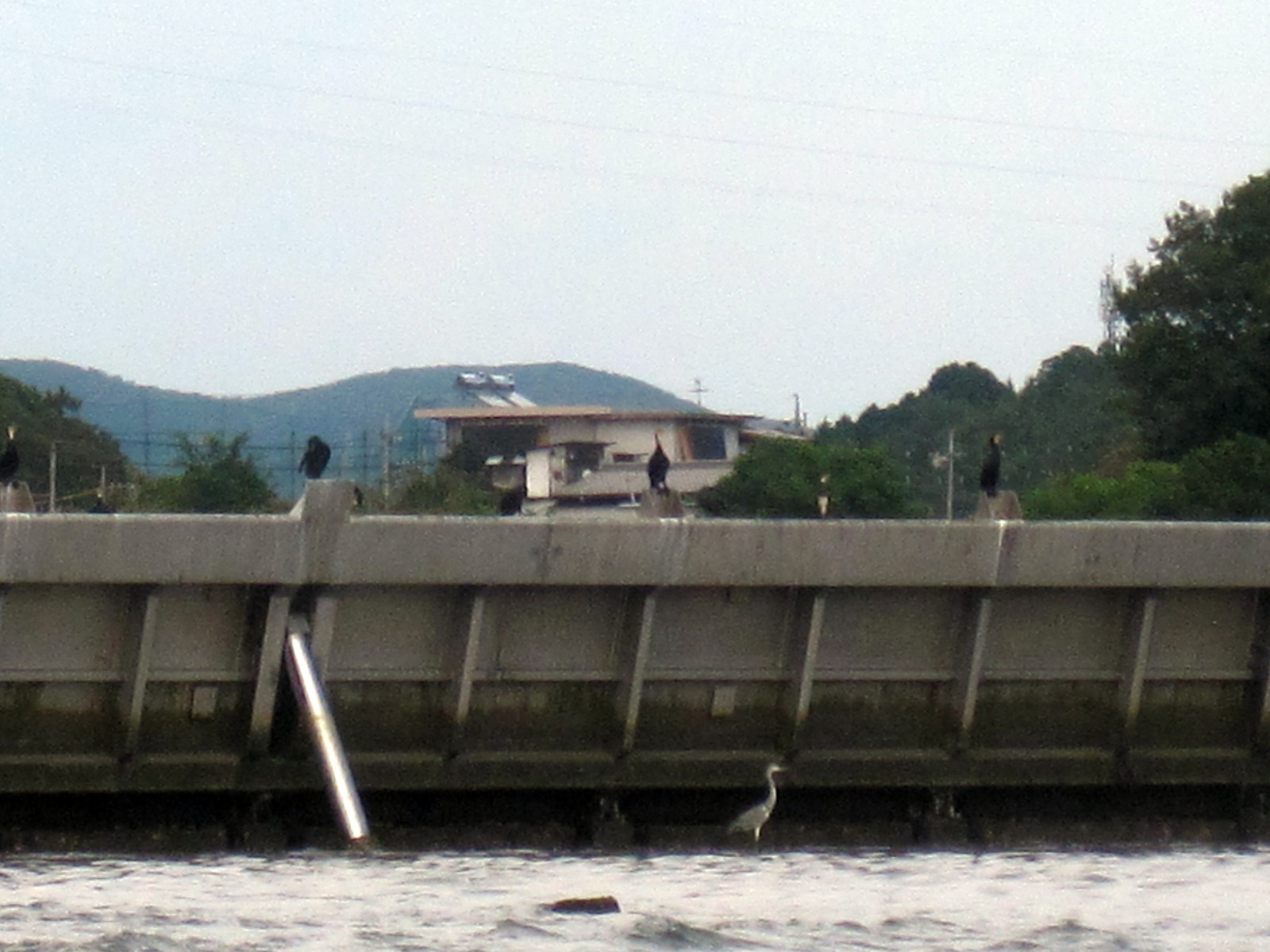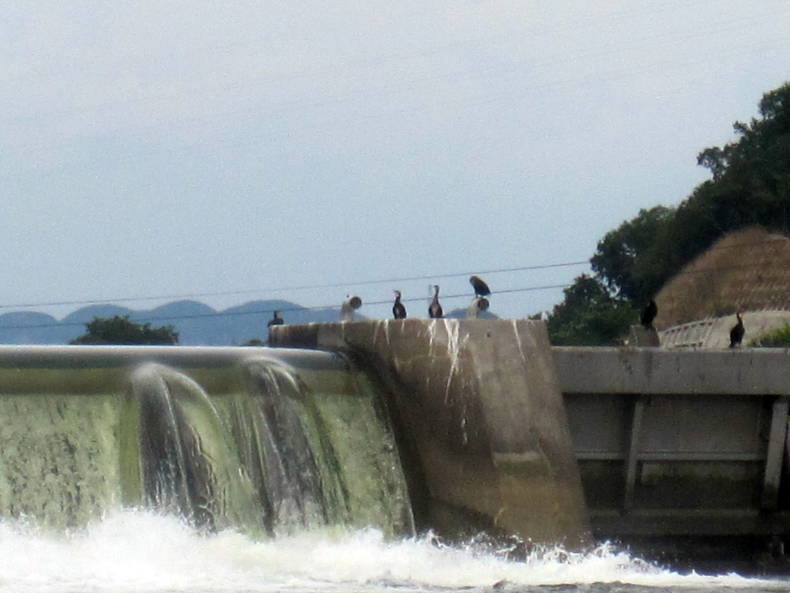 堰のところには,サギかな? 一杯整列中! そして,赤穂線を電車が通過していきます。