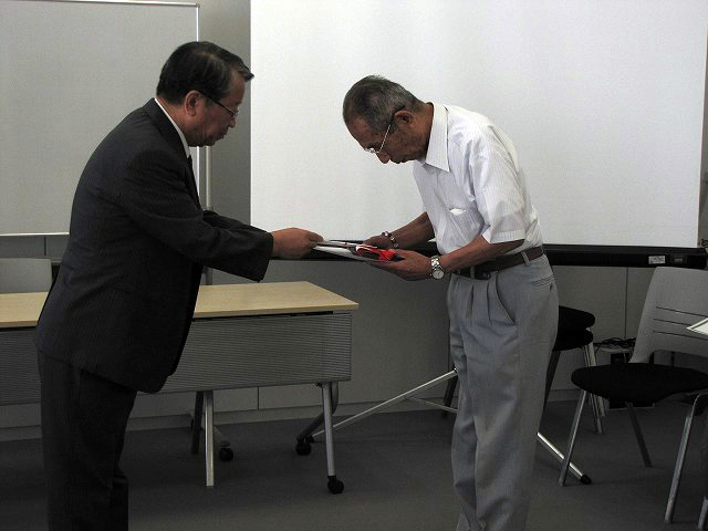 | 2013.8.23.吉備創生カレッジ認定証書授与式 大学コンソーシアム岡山の展開する市民向け講座「吉備創生カレッジ」(要受講料)。1科目90分×3回の授業ですが,2科目で1単位を受講生の方には認定させていただいています(ちなみに,大槻は吉備創生カレッジを担当する社会人教育委員会の委員長を務めています)。今期で,20単位を取得された方が4名,いらっしゃったので,認定証書授与式を執り行いました。4名の方,それぞれに累積単位は,40単位が2名,60単位が1名,そして区切りの100単位が1名です。 40-60単位の方を大槻から表彰させていただき,100単位の方は,大学コンソーシアム岡山運営委員長である理科大学堂田先生から表彰,記念の盾は,共催していただいています山陽新聞社の林氏から授与されました。 本当に,この向学心と熱心なご姿勢には頭が下がる思いです。 吉備創生カレッジも益々,充実させていかねばなりませんね! おめでとうございました。 |