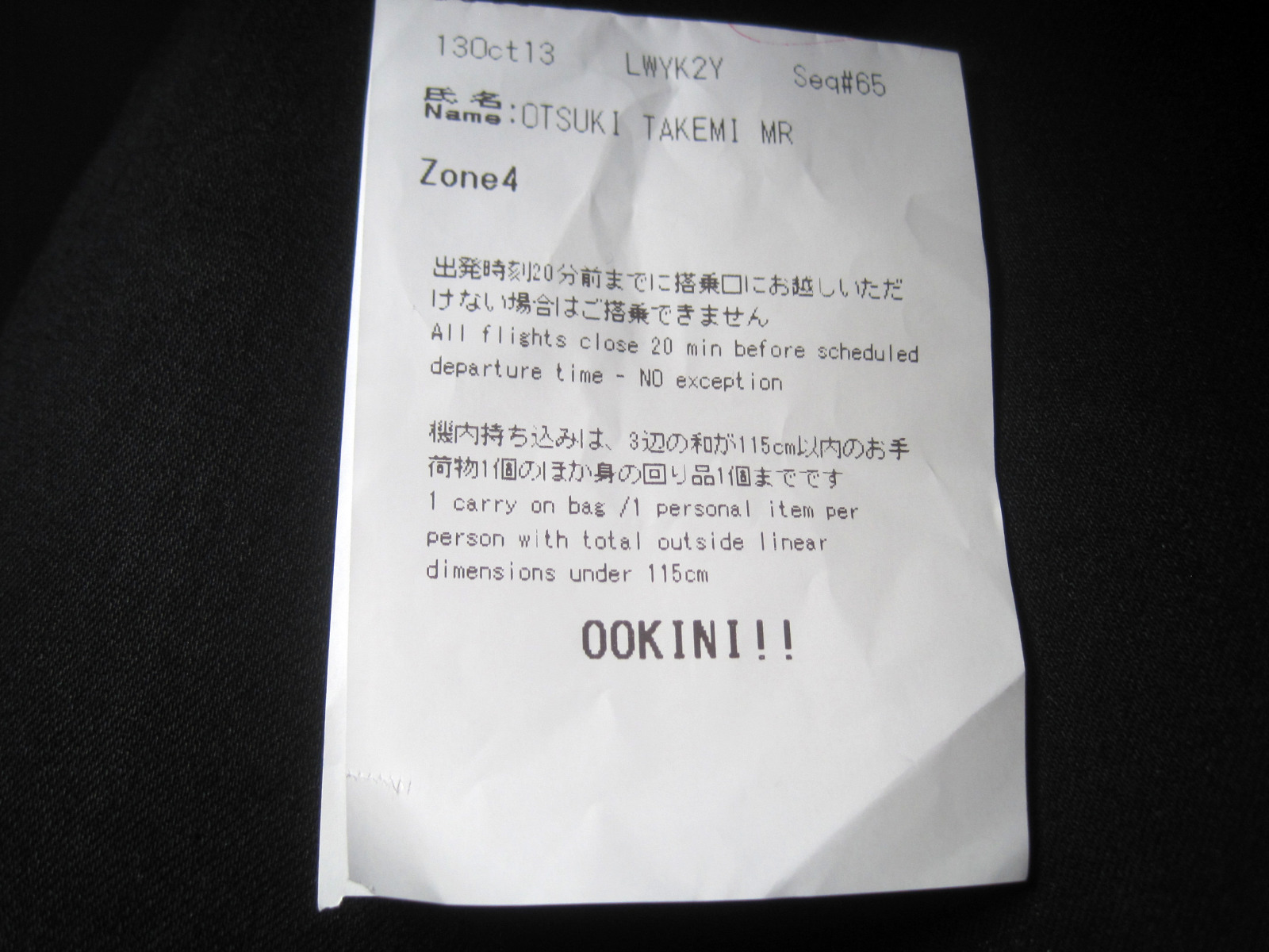 で,Peachで関空へ!機内アナウンスでも,最後にアテンダントさんも「ホンマにおおきに」って,そして搭乗券にもOOKINI!