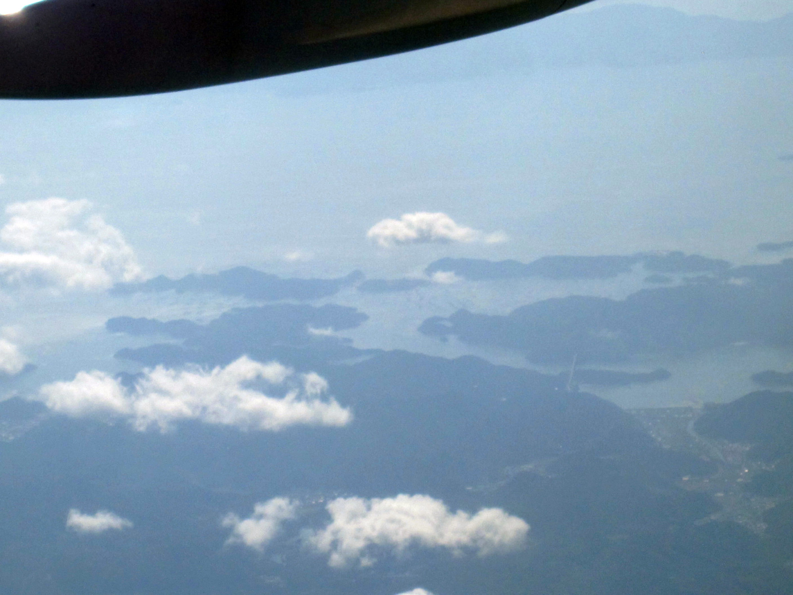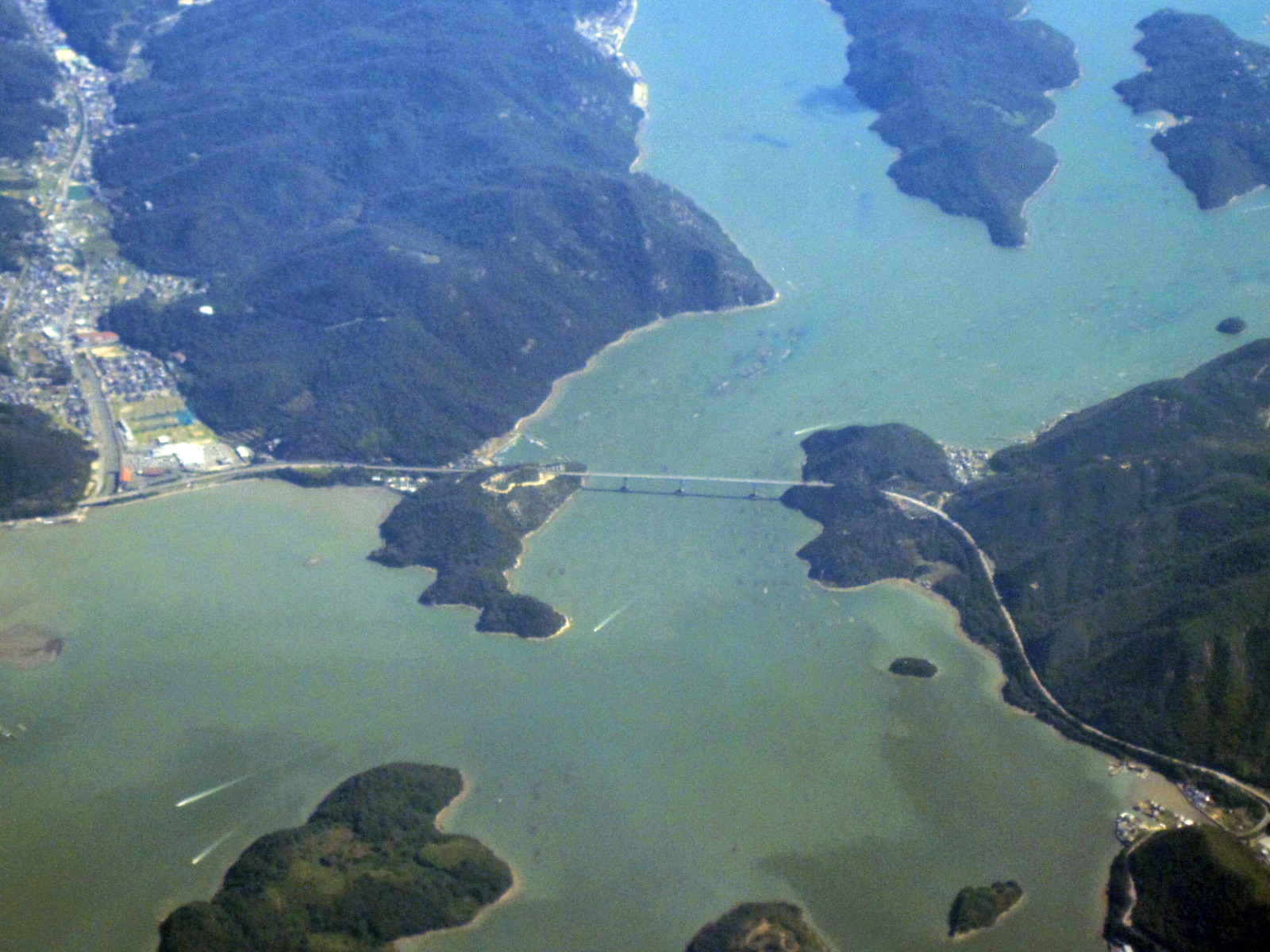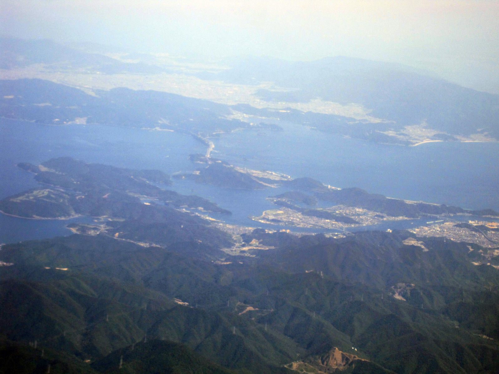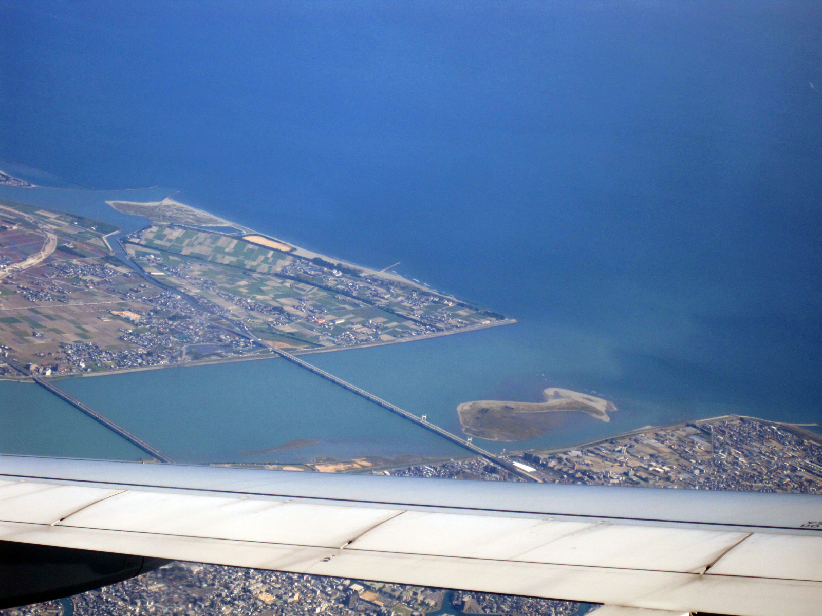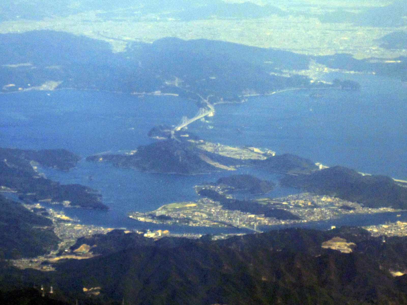 なんと新千歳から関空に飛ぶのに岡山県備前市上空:日生〜備前のブルーラインの橋も! |