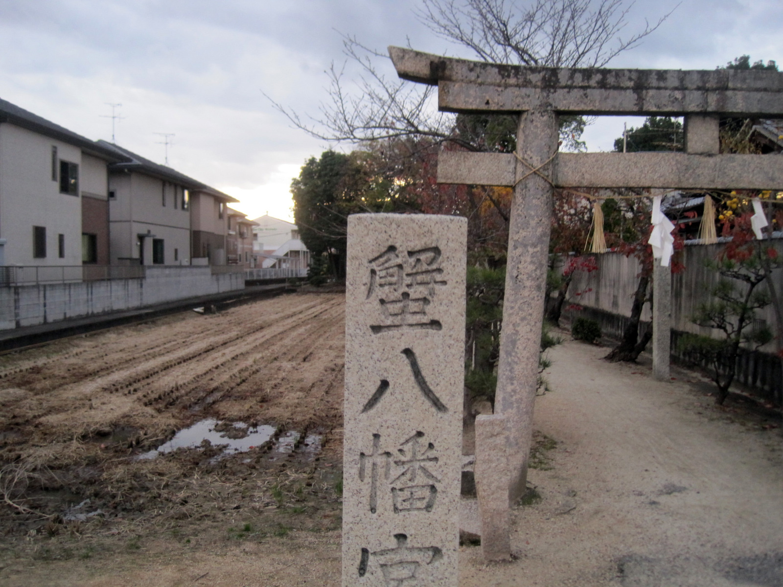 【蟹八幡の創立時期ははっきりとした言い伝えが残っていない。しかし、創立時の縁起は、伝説としてしっかりしたものが残り、大きな片爪蟹の化石が社宝として残されている。縁起によると、平氏の一族でであった妹尾氏が妹尾を中心に開発を進め、前田氏が、野殿山の鬼を退治して、野田や今の村々を造成している時期、その中間地点にある、久米の村々には、次々に移住者が増えて、どんどん家も立ち、集落が大きくなっていった。村人は、村の守護神をお祭りするために(応神天皇と神宮皇后 社宝の蟹の化石が合祀されている。)、お宮を建てようと相談していた。そんなある朝のこと、大きな岩のような蟹が東西三間南北2間足らずの長方形を描いて後に南側の海に消えて行った。この場所に現在の蟹八幡が鎮座している。】とのことです。