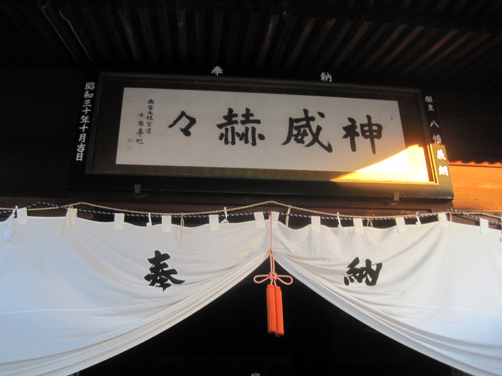 【社記によると応神天皇がご即位22年淡路、播磨、小豆島を経てこの地に国見の巡幸をされた折り、海辺に玉子に似た光り輝く石をご覧になり、殊の外ご機嫌麗しく今度は亀のかたちをした小さな丘でお憩みになりました。里人はその跡に祠を建てこの地を聖地として崇め続けたと伝えられています。のち平安の代になって、この亀のかたちをした聖地はその由緒をもって京から宇佐八幡宮へ勅使を派遣する際のご参詣及び宿泊地となり、やがて京の男山八幡宮と併せ宇佐の御分霊、ホンダワケノミコト(応神天皇の御神名)ほかを勧請し亀山八幡宮(明治以降の登記は久保八幡宮)へと発展しました。玉の浦(尾道水道のこと)を望む境内地、亀山の千五百年の悠久にして尊い時の流れです。】とのことです。