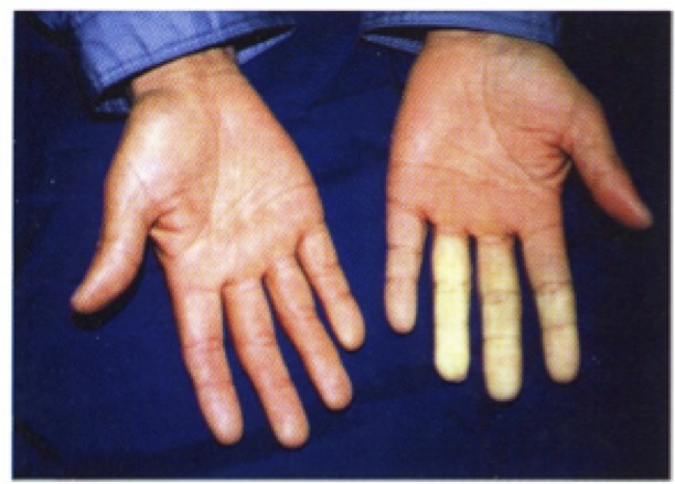 職業性疾病患者における写真の症状の原因として正しいものはどれか。