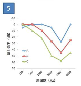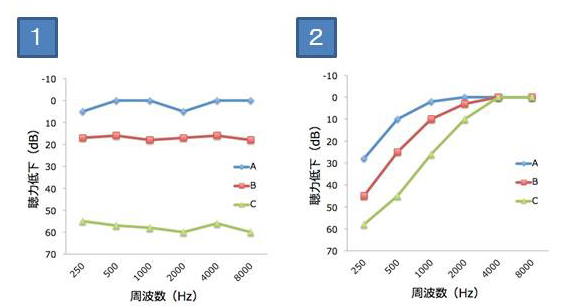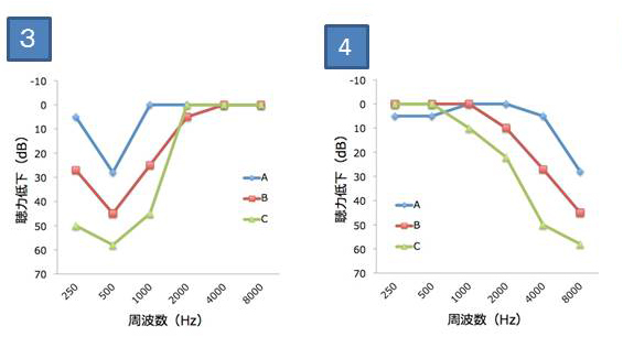 騒音性難聴の聴力低下(A→C)の特徴を示すグラフ(模式図)として正しいものはどれか。