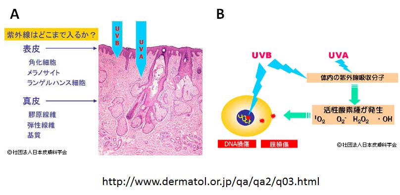 日焼けを起こす力で比べると、UVBはUVAの600-1000倍強いといわれています。しかし、UVAは日光に大量に含まれていますので、海水浴などで真っ赤に日焼けした場合(サンバーン)、その責任割合はUVBが7-8割、UVAが2-3割と見積もられています。シミ、しわ、皮膚癌などの慢性皮膚障害(光老化)についても圧倒的にUVBの影響が強いのですが、UVAも皮膚の深く、真皮にまで到達するという点でUVAの作用も無視できません。UVB、とUVAの一番大きな違いは、UVBは細胞の核内にあるDNAに直接吸収されてDNAに傷をつけてしまいます(図B)。】