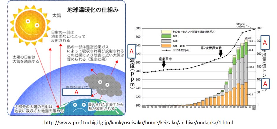 栃木県のWEBであるが地球温暖化について提示してある。 A (図中に4箇所ある)について正しいのはどれか。