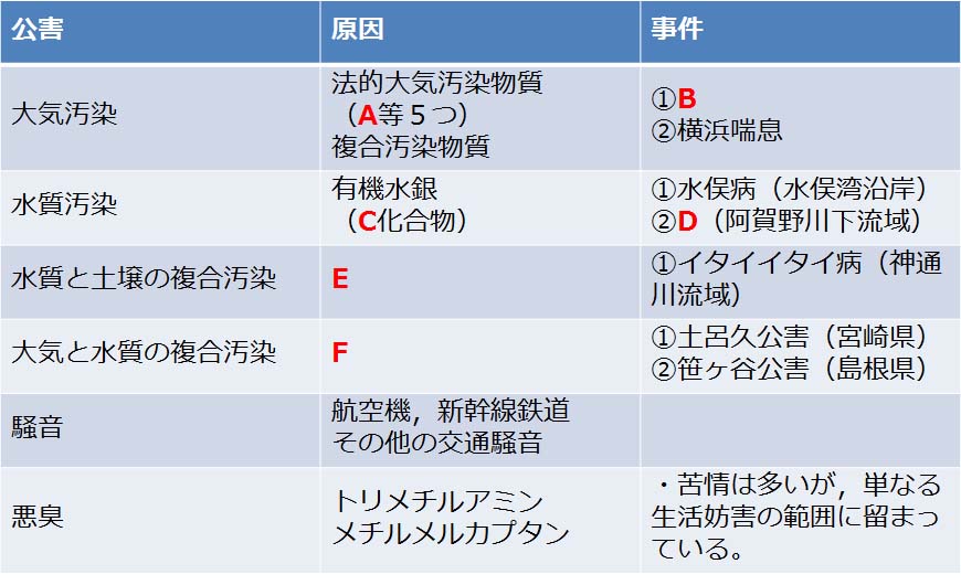 公害についての表である。正しい組み合わせはどれか。