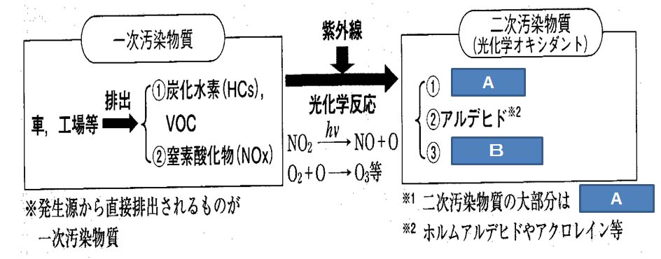 図は光化学スモッグの発生機序を示す。図のAとBとして正しいのはどれか。