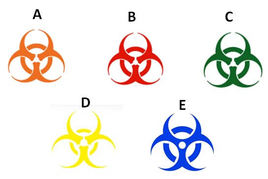 バイオハザードマークを示す。注射針はどのマーク?