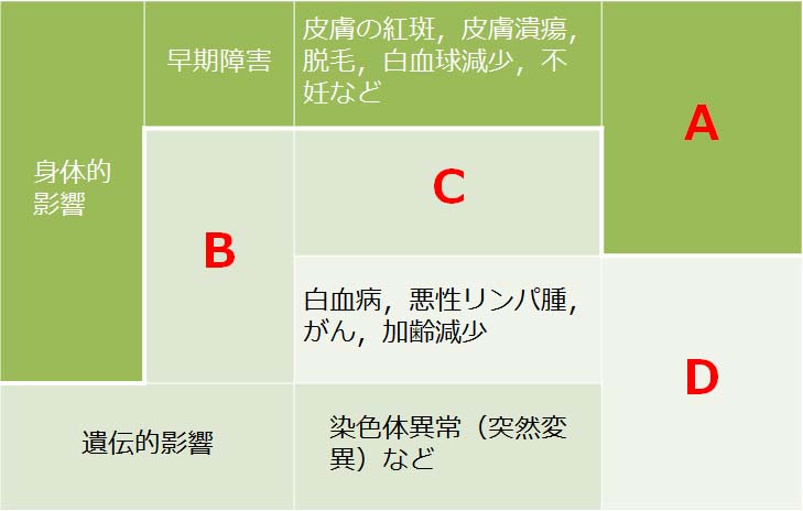 a. A:確定的影響,B:晩発障害