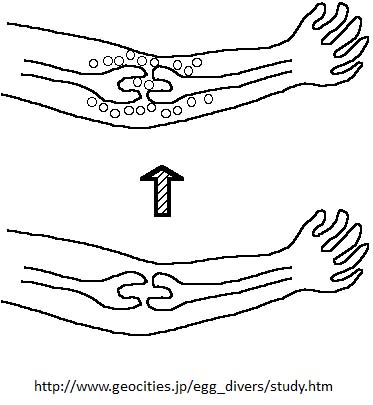 図は減圧症をダイバーに教える勉強会の図である。上図の気泡はどれか?