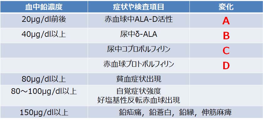 血中鉛と症状や検査項目の表を示す。A~Dとして正しいのはどれか。