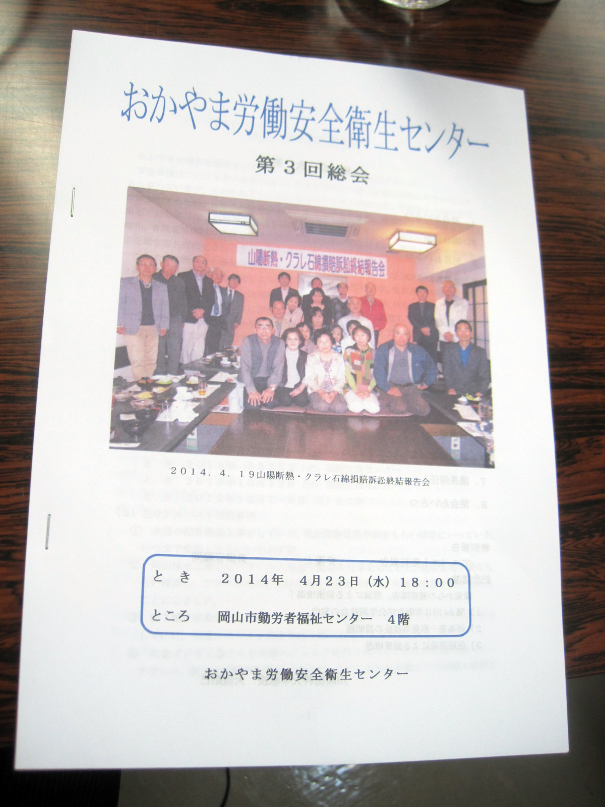 そして,第3回おかやま労働安全衛生センターの総会に,顧問として出席とともに,記念講演をしました。