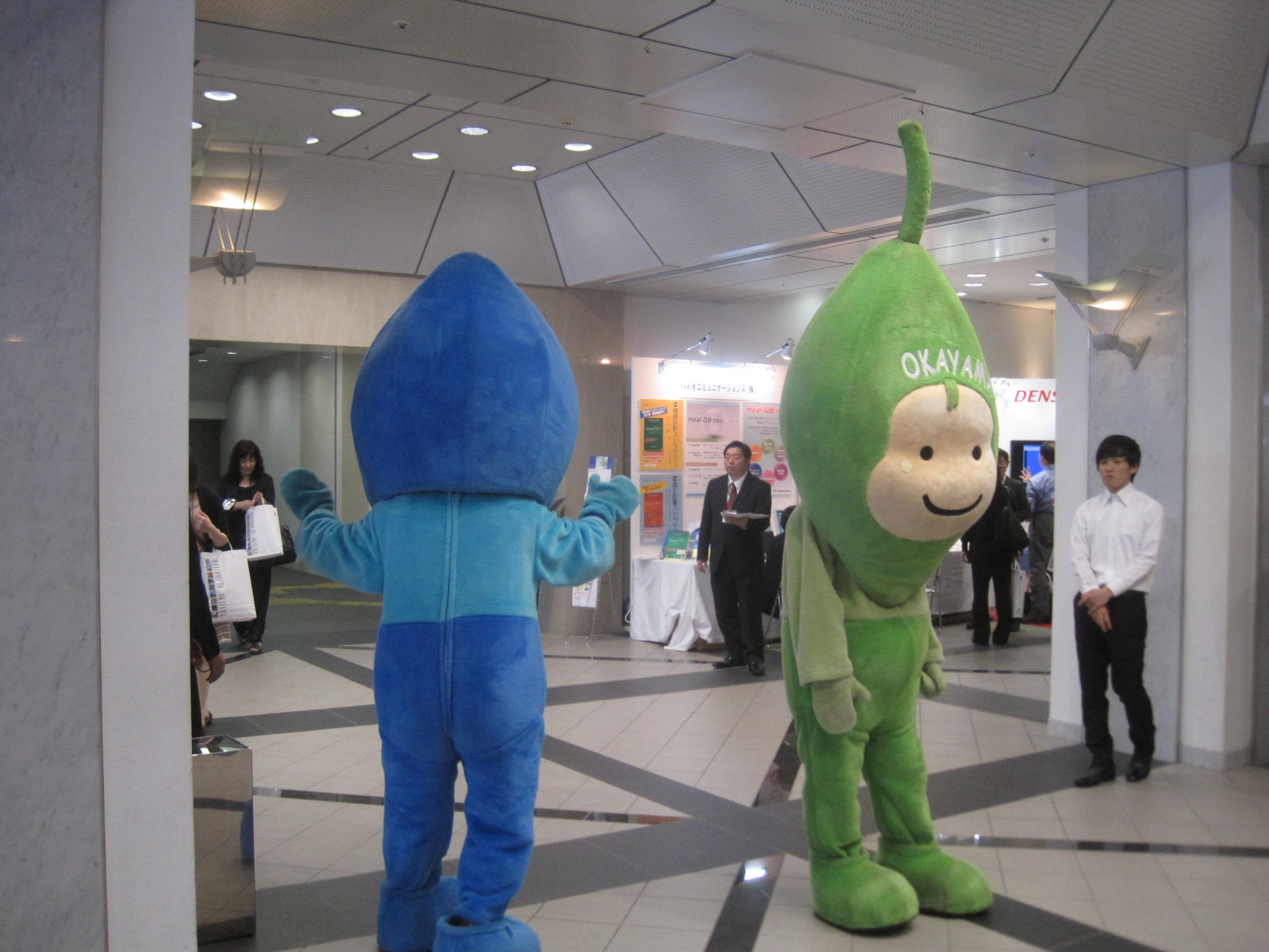 秋の公衆衛生学会から,PRにとちまるくん(今度は獨協大学の武藤教授の主催で宇都宮です,なので,教室の先生が着ぐるみの中に入って,頑張ってPRされていました)。そして,荻野会長が,とちまるくんが来るのなら,岡山もってことで,岡山市のゆるキャラ「ミコロ」と「ハコロ」がお出迎え(中は,岡大の大学院生さんですが)。