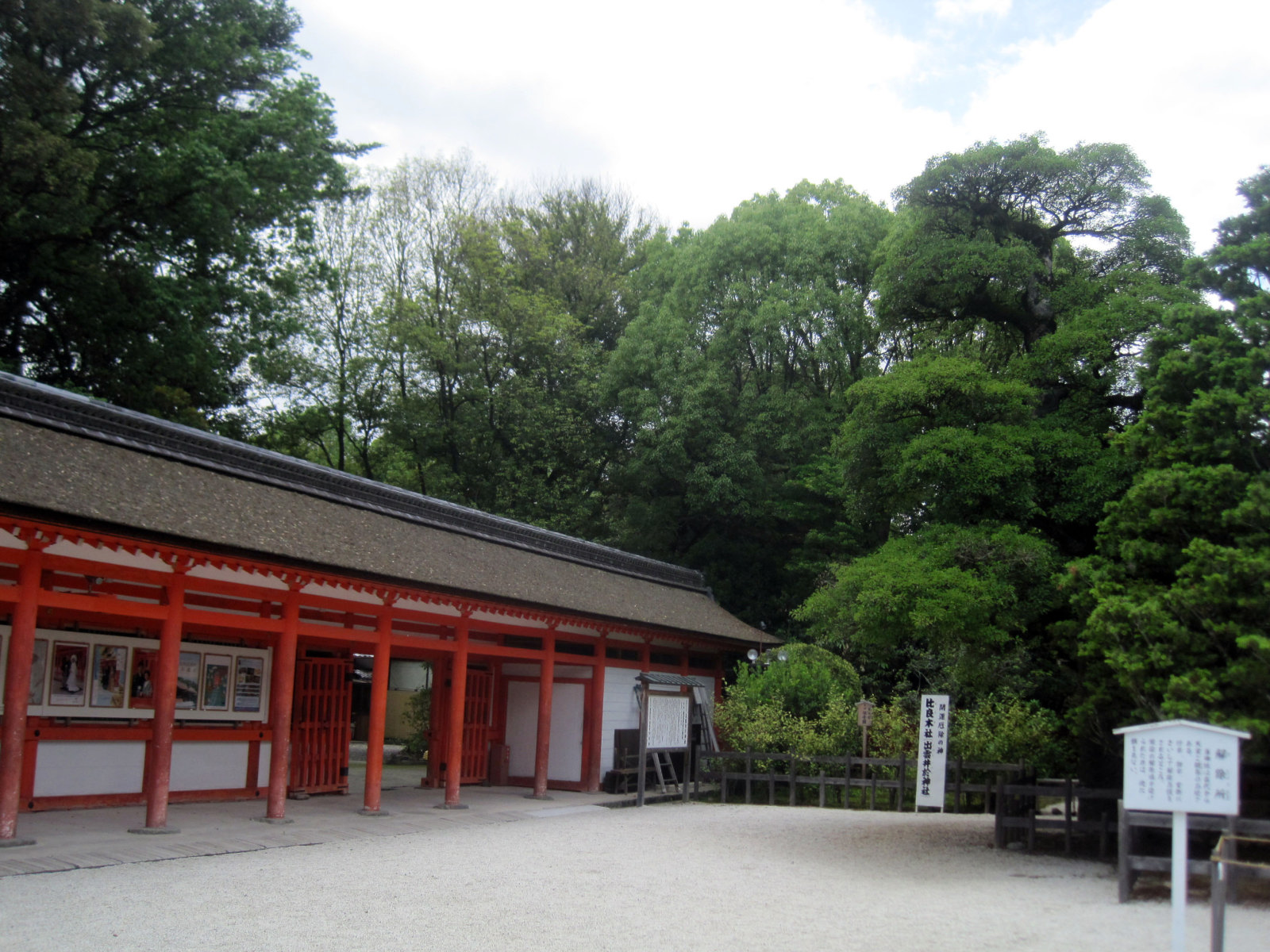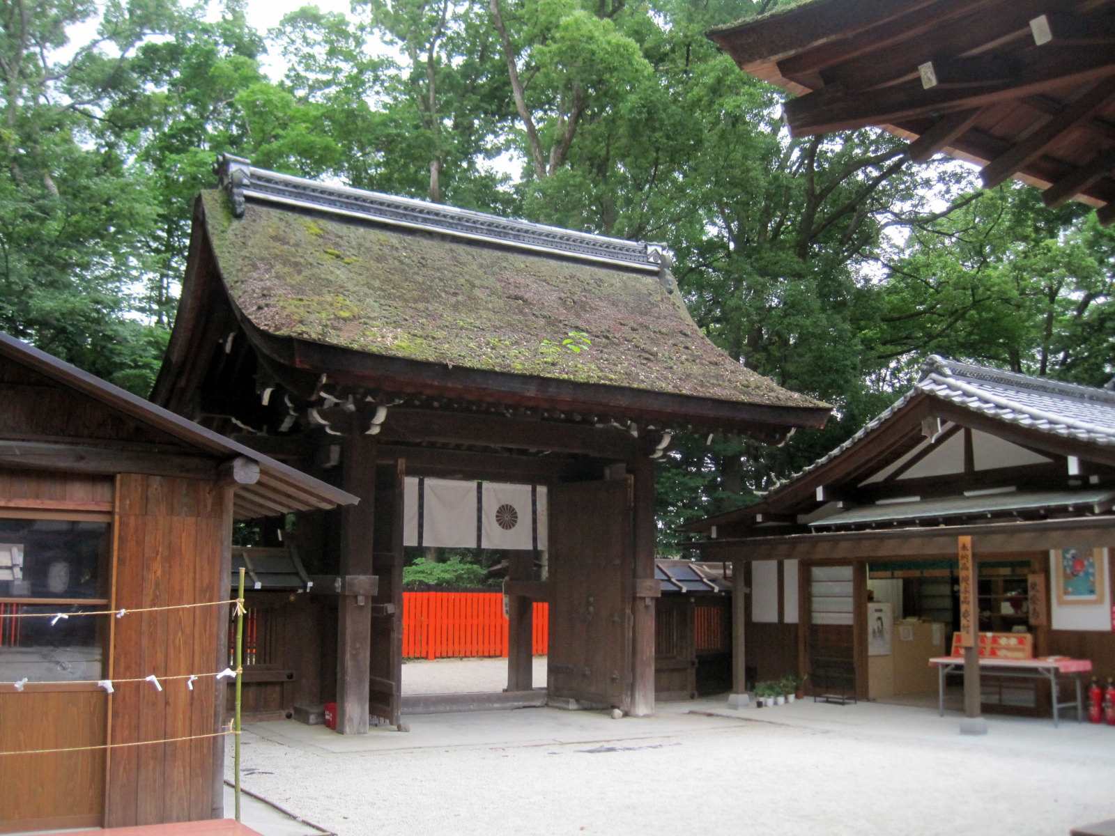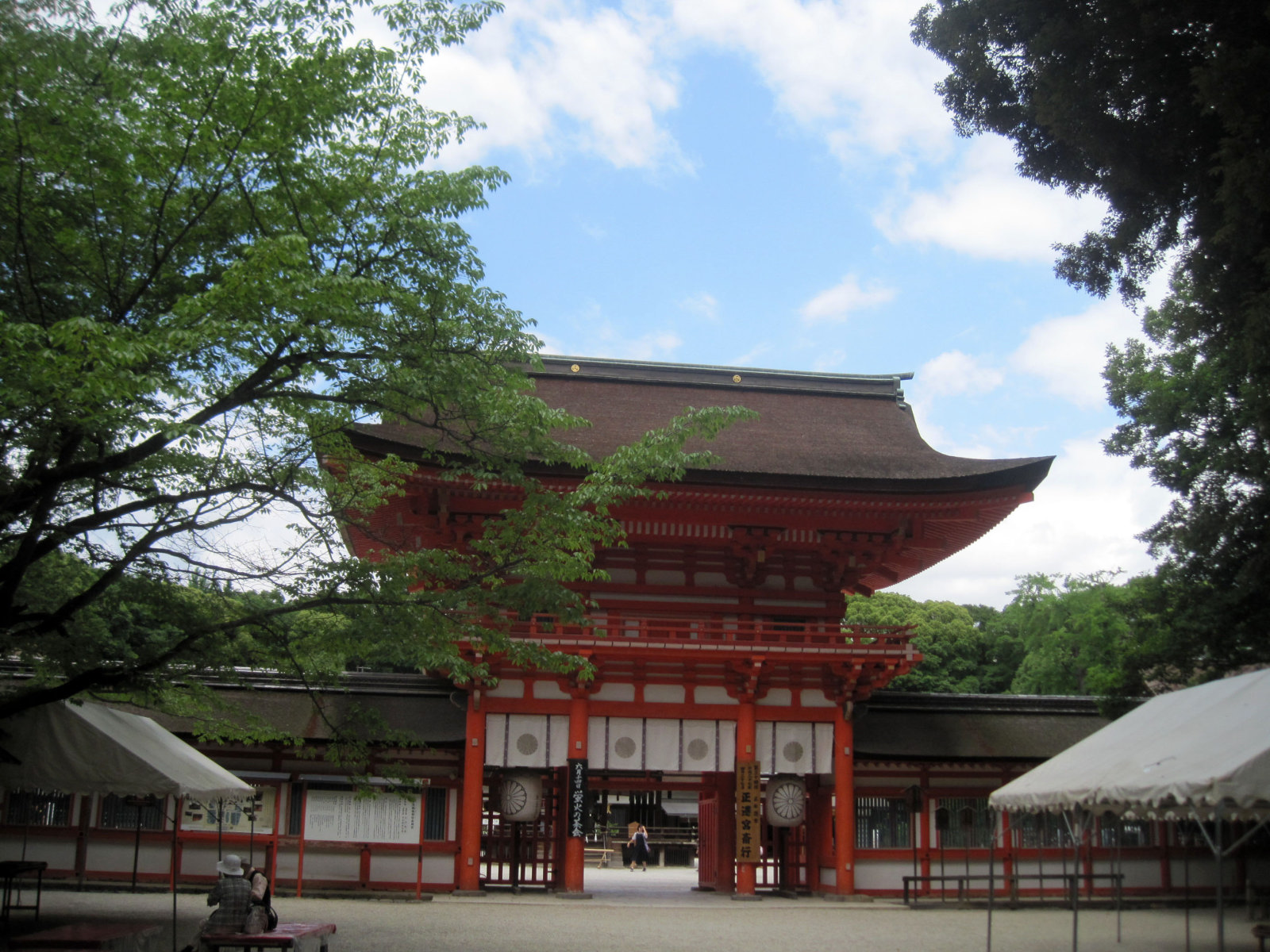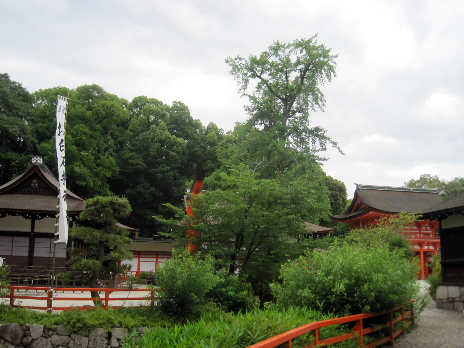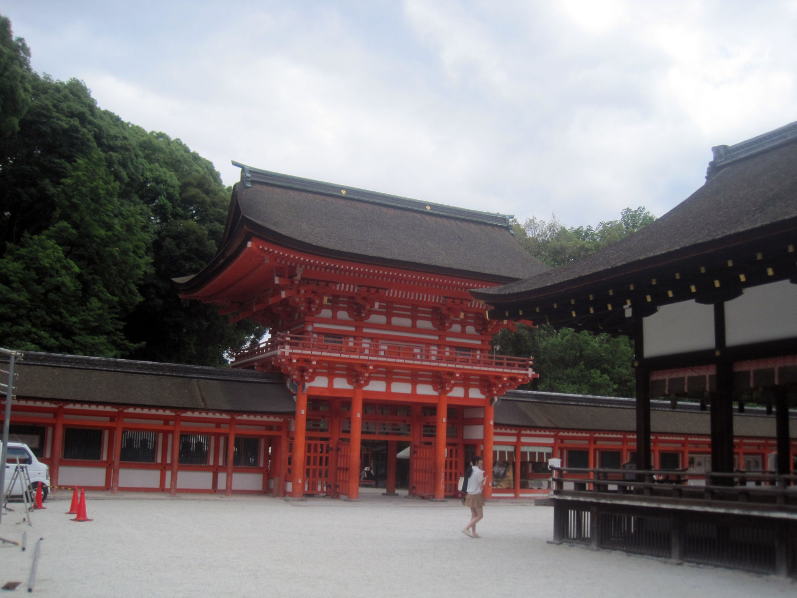 【平安期以前の創祀で京最古の社の一つで山城国一の宮と崇められ、国事を祈願し、国民の平安を祈る神社として「賀茂斎院の制」「式年遷宮の制」等が定められた。祭神は賀茂建角身命と玉依媛命。国史跡「糺の森」の広大な境内には本殿(国宝)2棟や53棟の重要文化財社殿が並び、1994年(平成6)12月「古都京都の文化財」として、「世界遺産条約」に基づく世界文化遺産に登録された。5月15日の葵祭は優雅な王朝絵巻を再現する。】