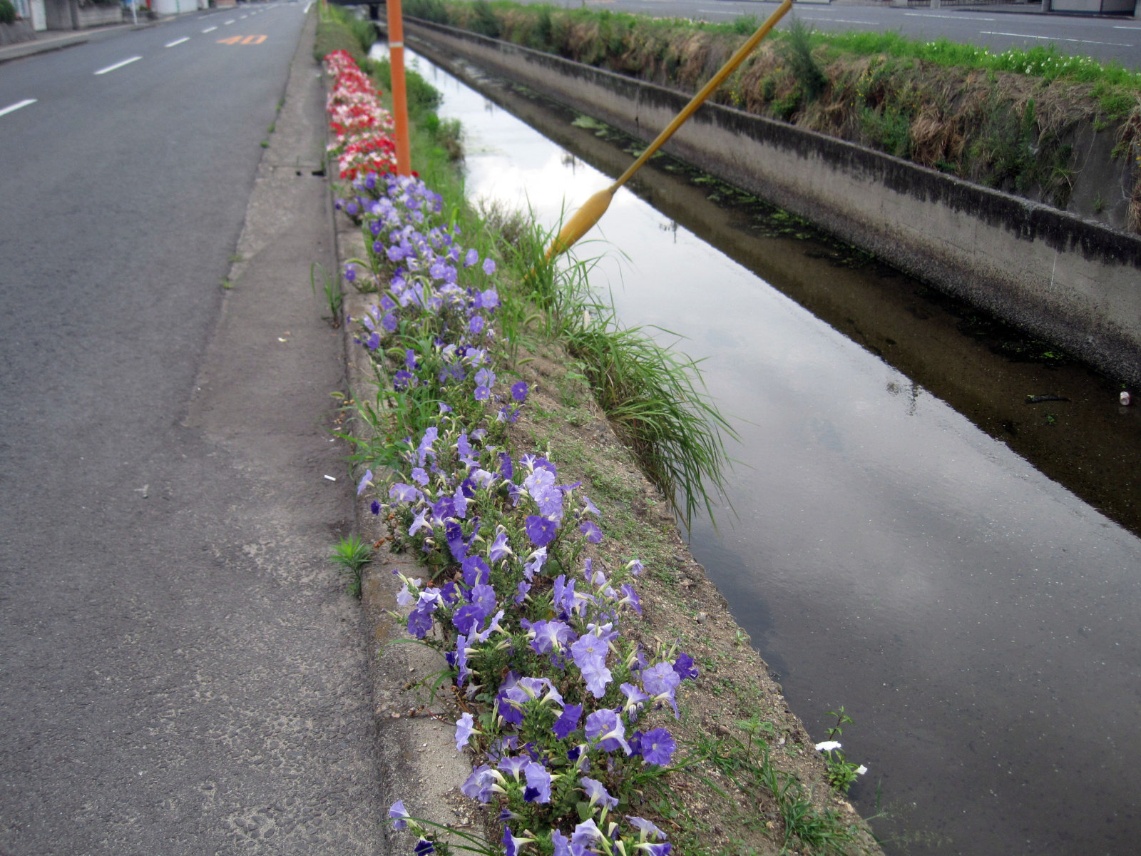 向かいに八間川という川の真ん中に農業排水と工業廃水を分離する壁のある川・・・っていうか下水路っていうか,が,ありますが,そこは今,フラワーロードとなってて,花々で溢れています。支所の周りも含めて,花々を垣間見れるのはいいですね!
