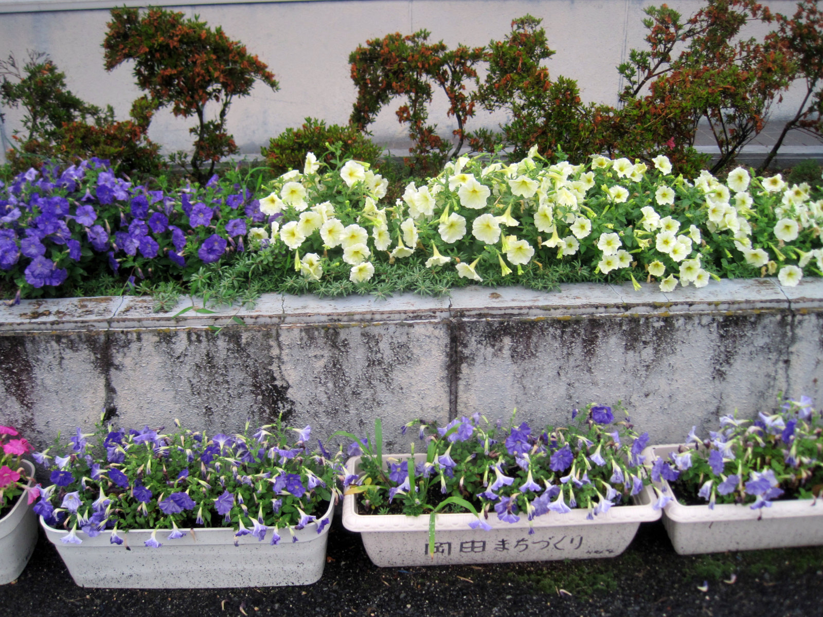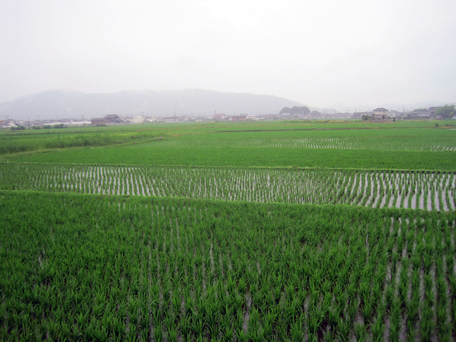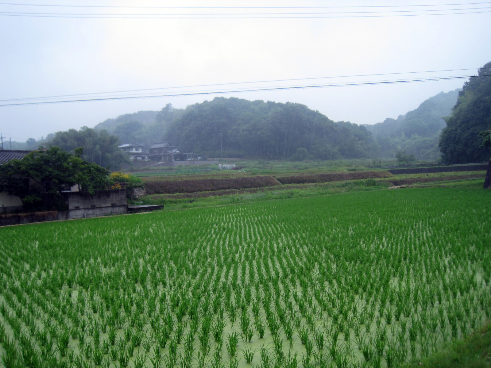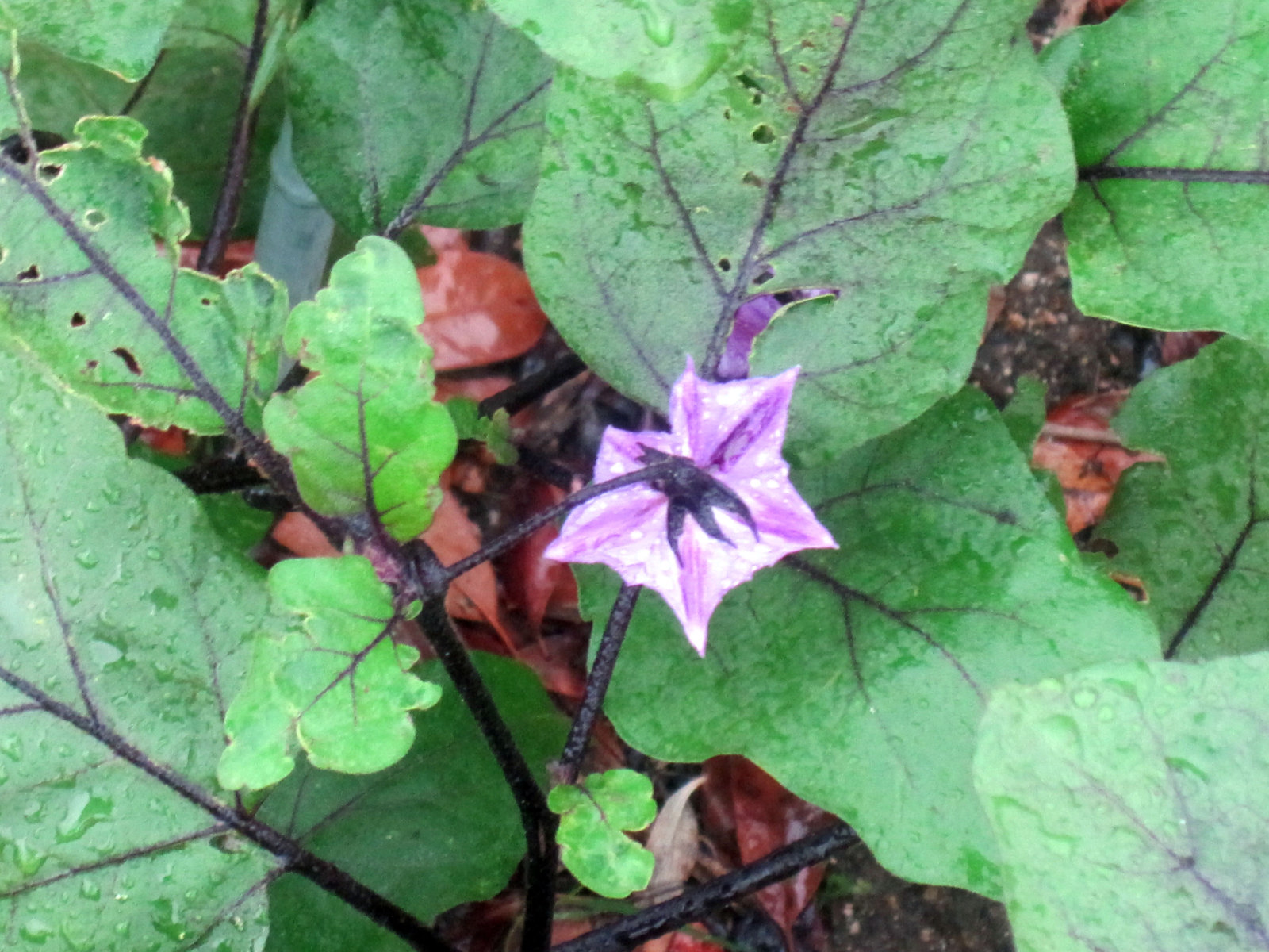 田植えも終わり,茄子の花も。そして小学生たちは雨の中,半数くらいは長靴で登校中です。