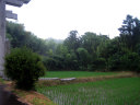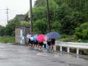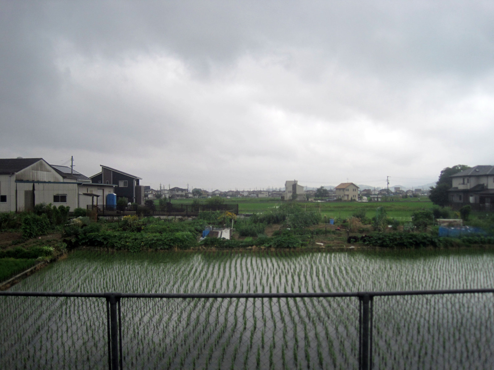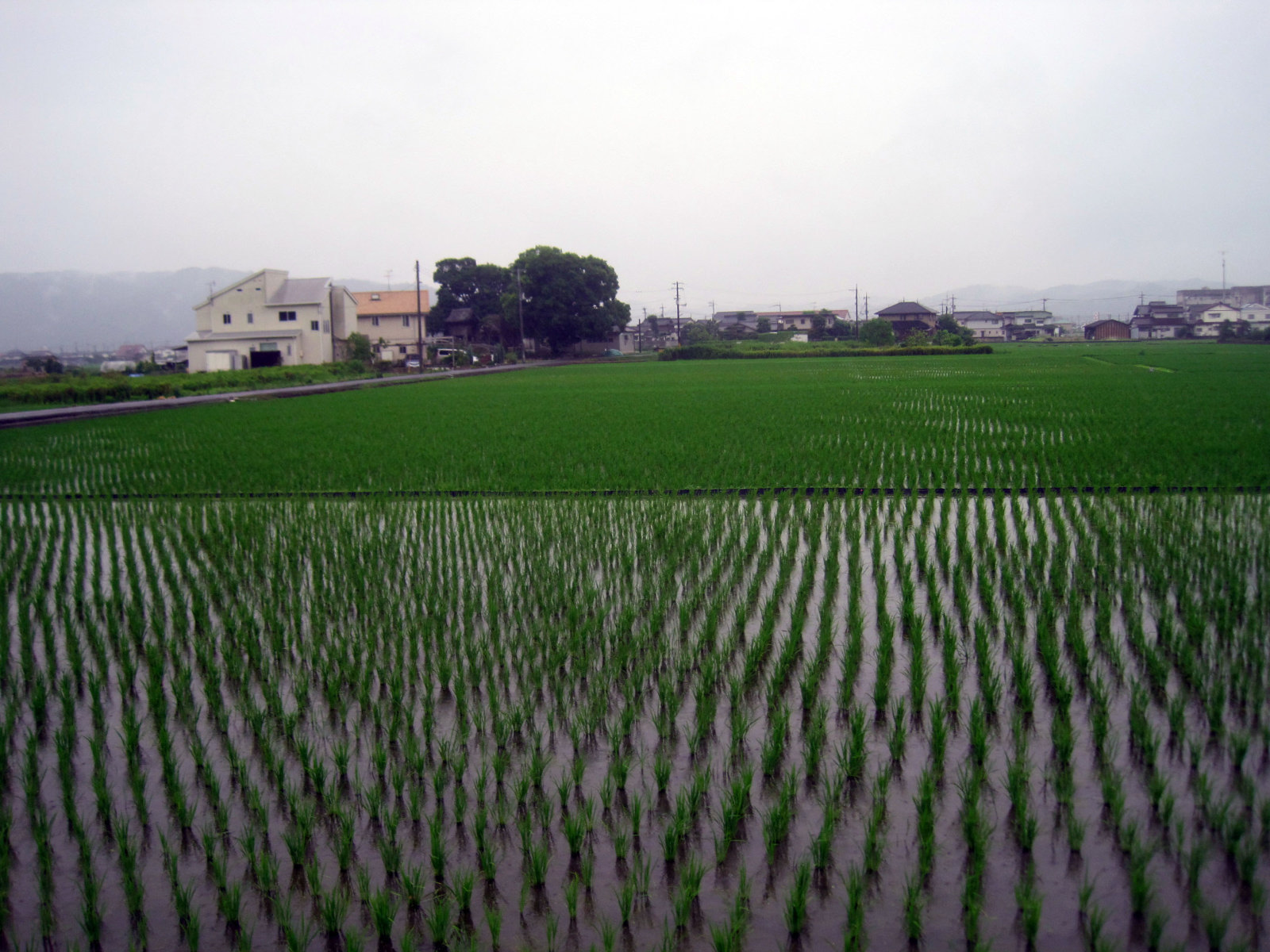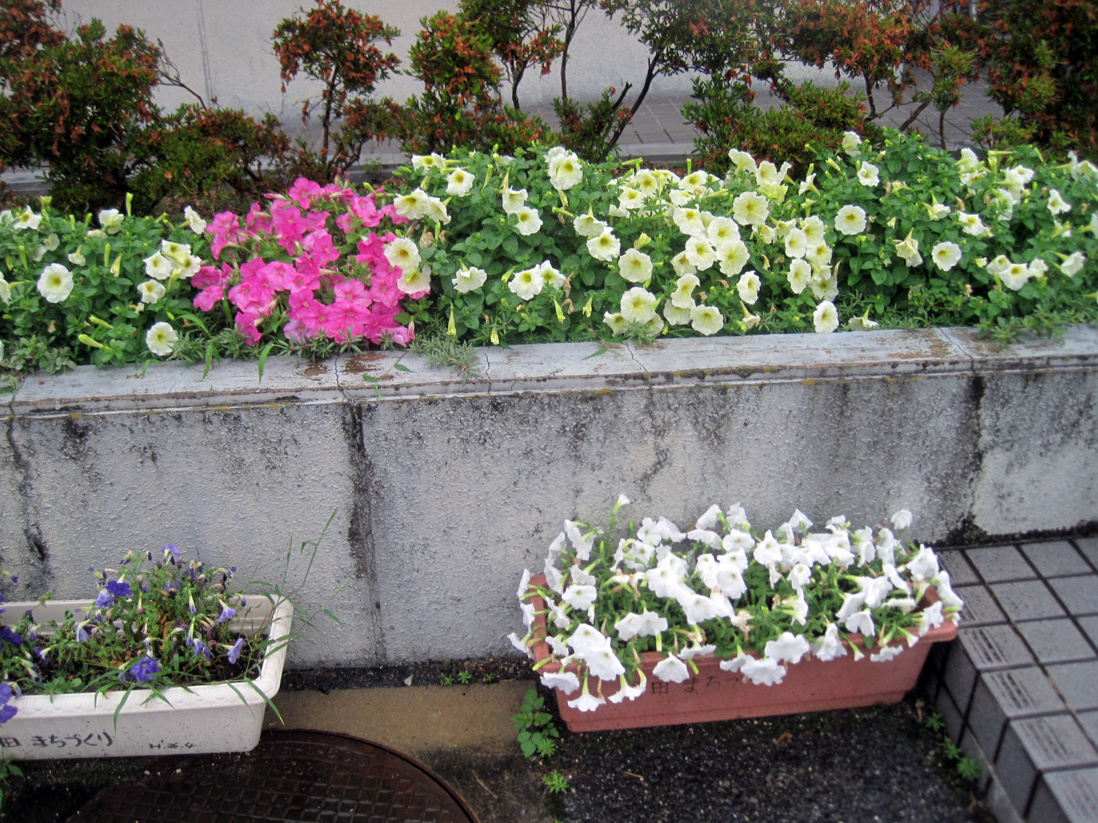 田植えも終わり,茄子の花も。そして小学生たちは雨の中,半数くらいは長靴で登校中です。