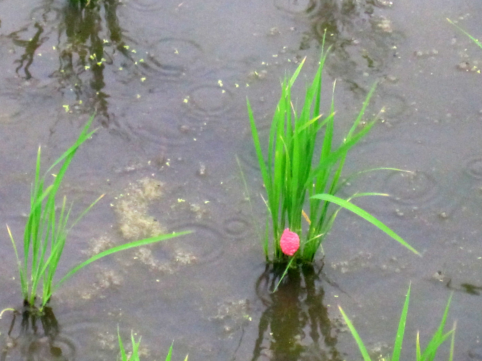 あら,ジャンボタニシ【スクミリンゴガイ(学名 Pomacea canaliculata)は、リンゴガイ科(リンゴガイ、アップルスネイル)の1種の淡水棲大型巻貝である。東アジア・東南アジア各地で、イネの害虫となっている外来種であり、世界の侵略的外来種ワースト100リスト選定種の1種ともなっている。日本では一般的に「ジャンボタニシ」と呼ばれており、かつてはタニシと同じタニシ上科