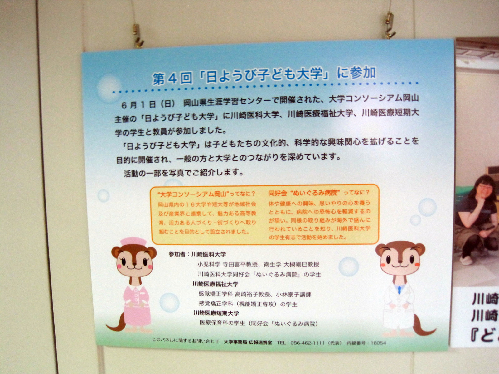 気付いたのは一昨日ですが,附属病院の8Fの高島屋売店からドトールコーヒーに向かう廊下に,先月の大学コンソーシアム岡山のイベント「日ようび子ども大学」のパネル展示が行われています。