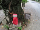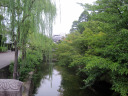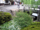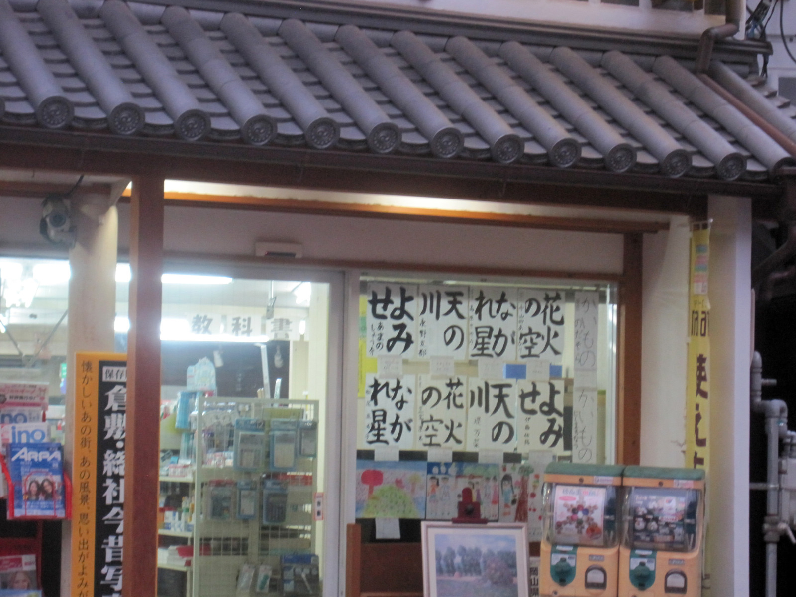 物語館の周囲なども歩いて・・商店の子どもたちの習字が,夏を誘っています。