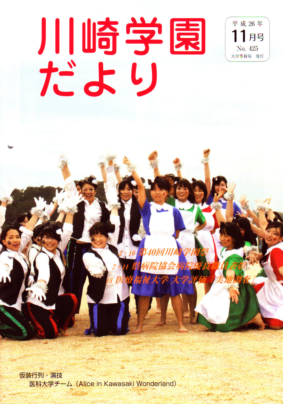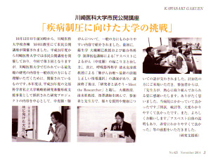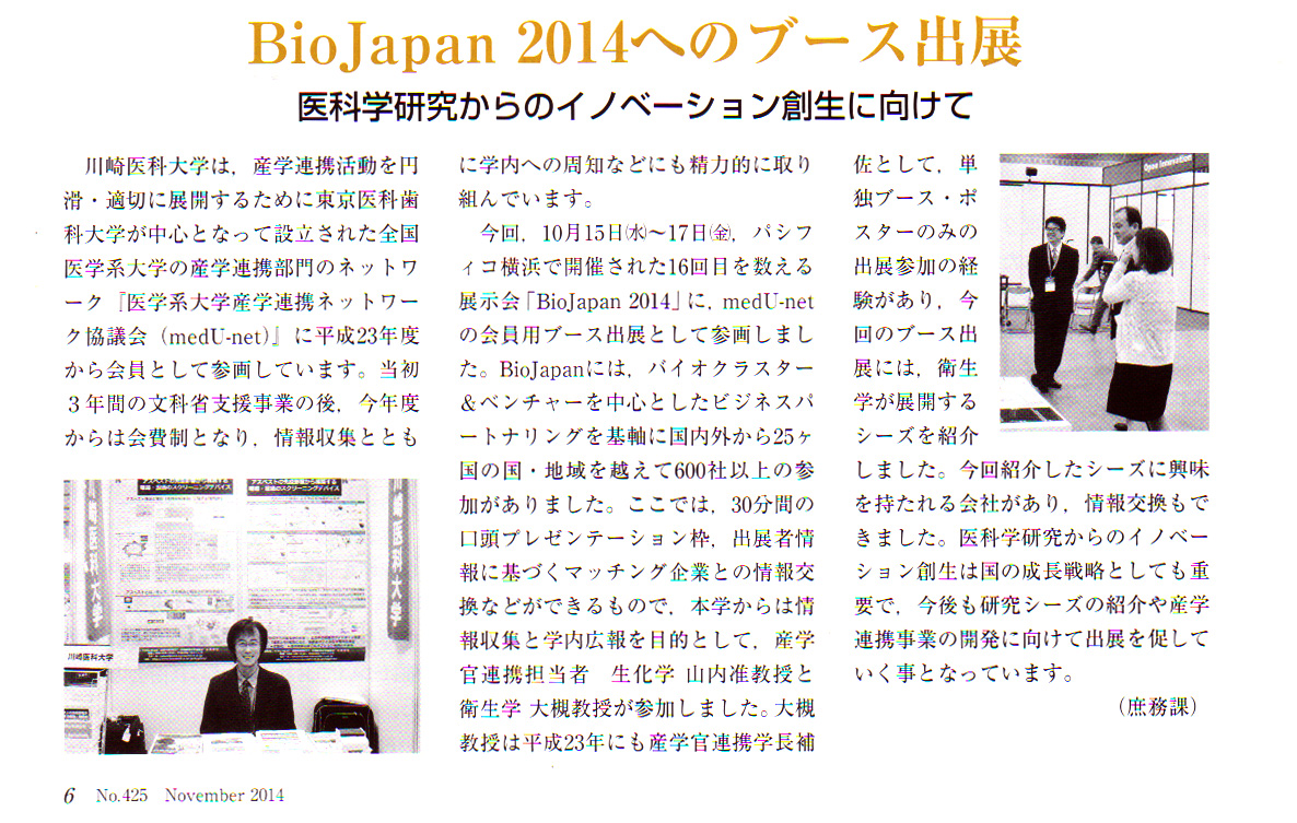 2014.11/27 本日届きました 川崎学園だより 平成26年11月号 No.425 p5には,10/12の市民講座の記事が掲載されています。 p6には,10/15-17のBioJapan出展の記事が掲載されています。 PDFはこちらから ありがとうございます,。