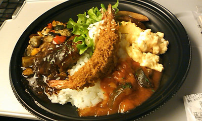 ブラックハヤシソースのハンバーグと海老フライ弁当でした。