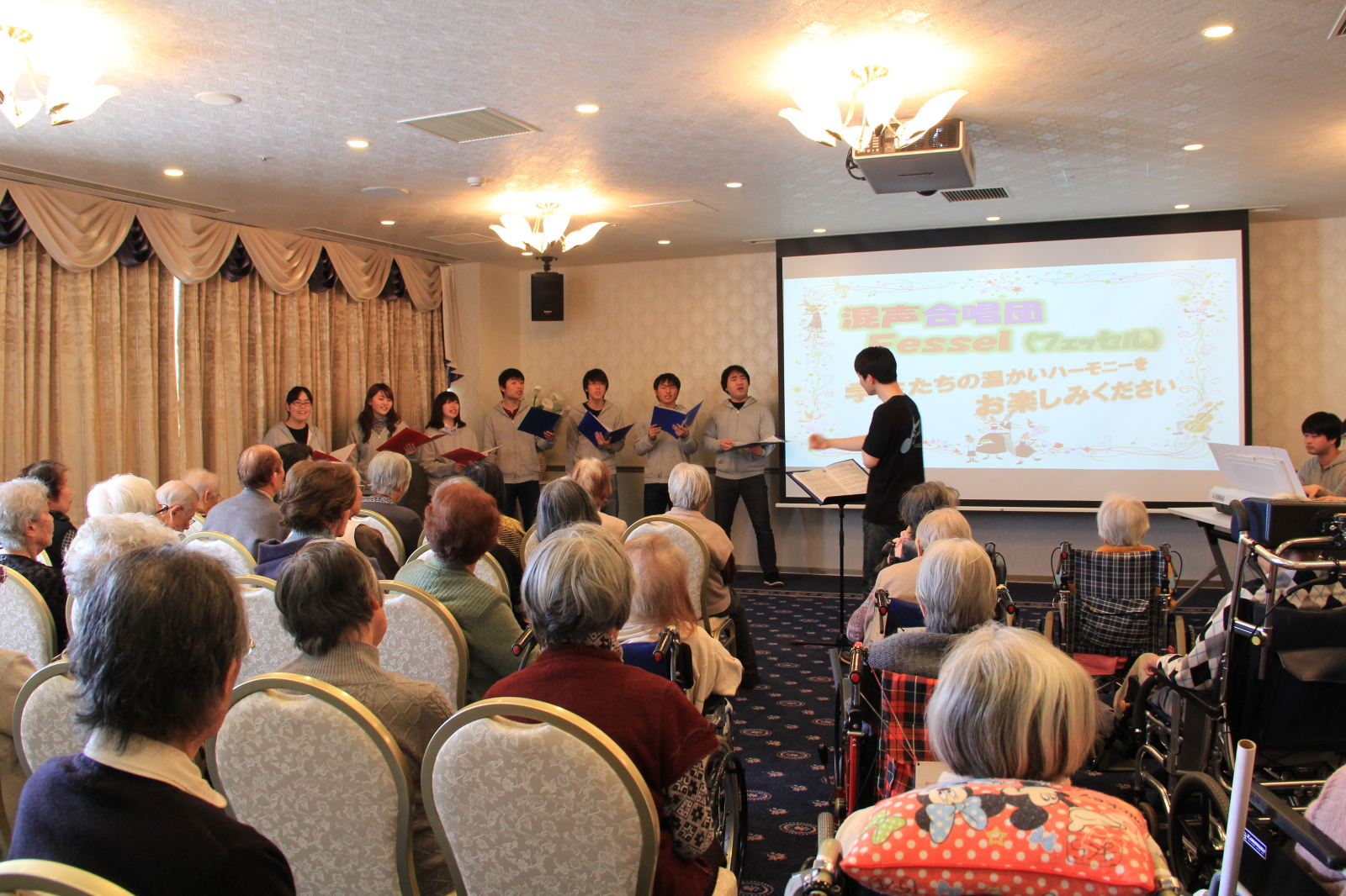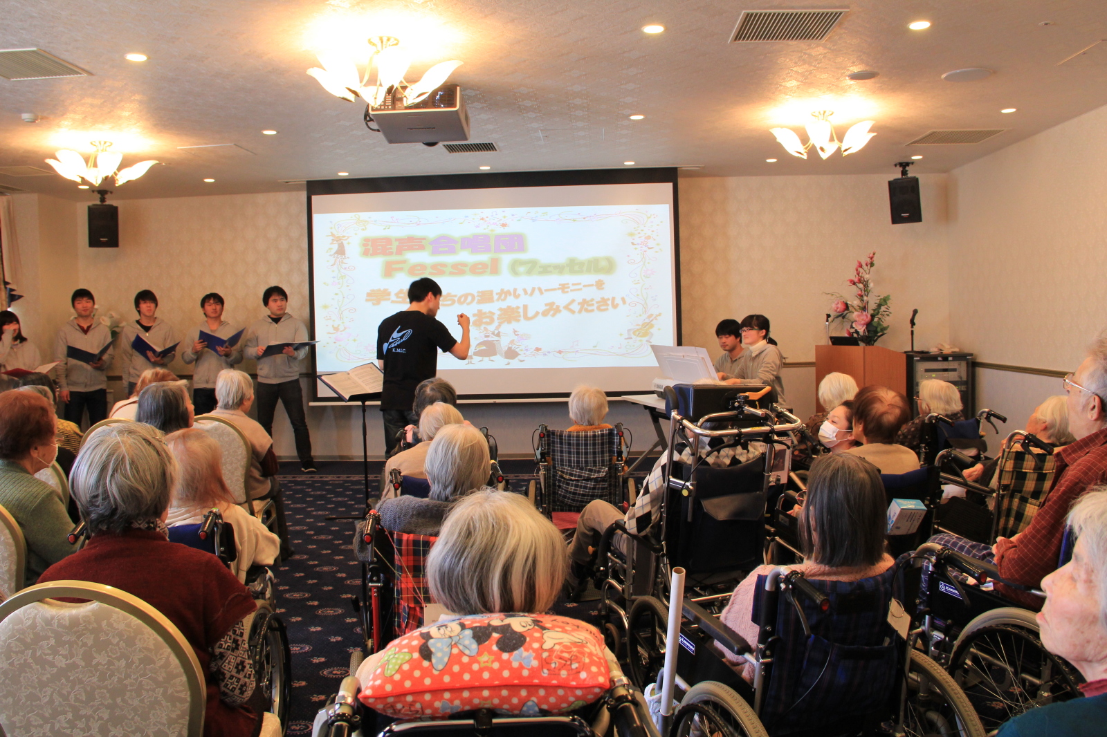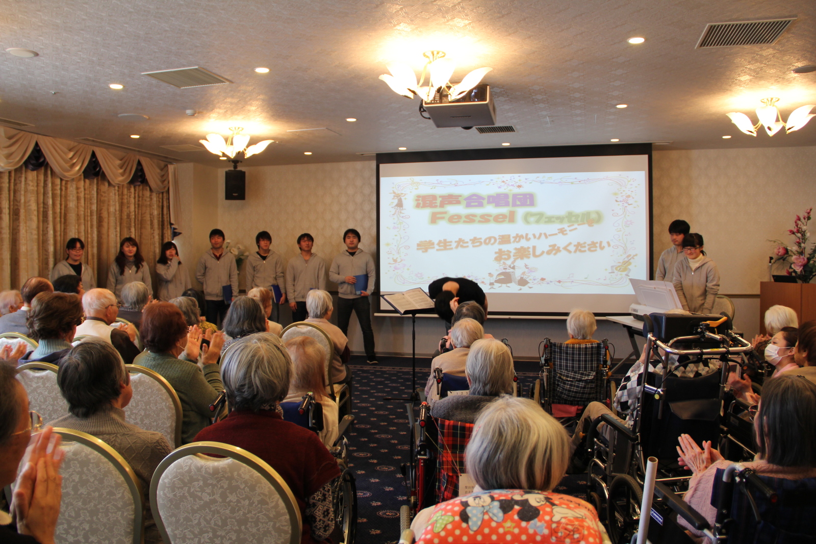 本年度も「地域に飛び出す学生支援」事業で,合唱部 Fessel が助成を受け,大学近くの「心温まる想いやりあふれるコミュニティタウン。倉敷の高齢者住宅、医療と介護は倉敷スイートタウン」にてコンサートを開催しました。