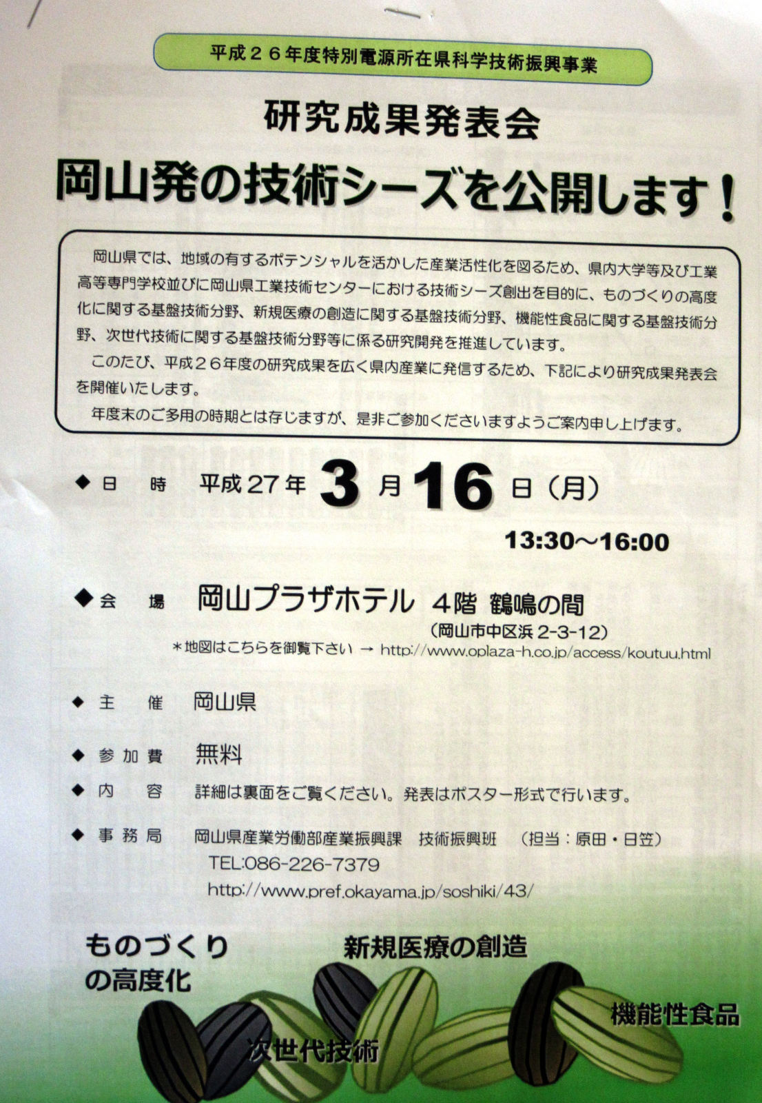 平成26年度特別電源所在県科学技術振興事業の岡山県分の研究成果発表会でした。