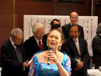 第85回日本衛生学会学術総会の懇親会は会場も兼ねるホテルアバローム紀の国で,宮下会長が「サプライズ2つ」・・・・最初に「音楽の夕べ」で沖縄出身のソプラノ歌手、宮良多鶴子さんのミニ・コンサート 震災被害地域への慰問や,東ティモールの子供たちとの交友なども含めて,心温まる歌唱でした。