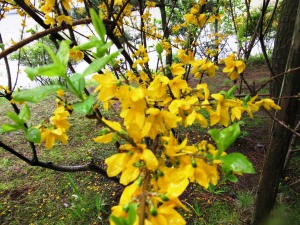 睡蓮池のほとりに枝垂桜が2本・・盛りです。