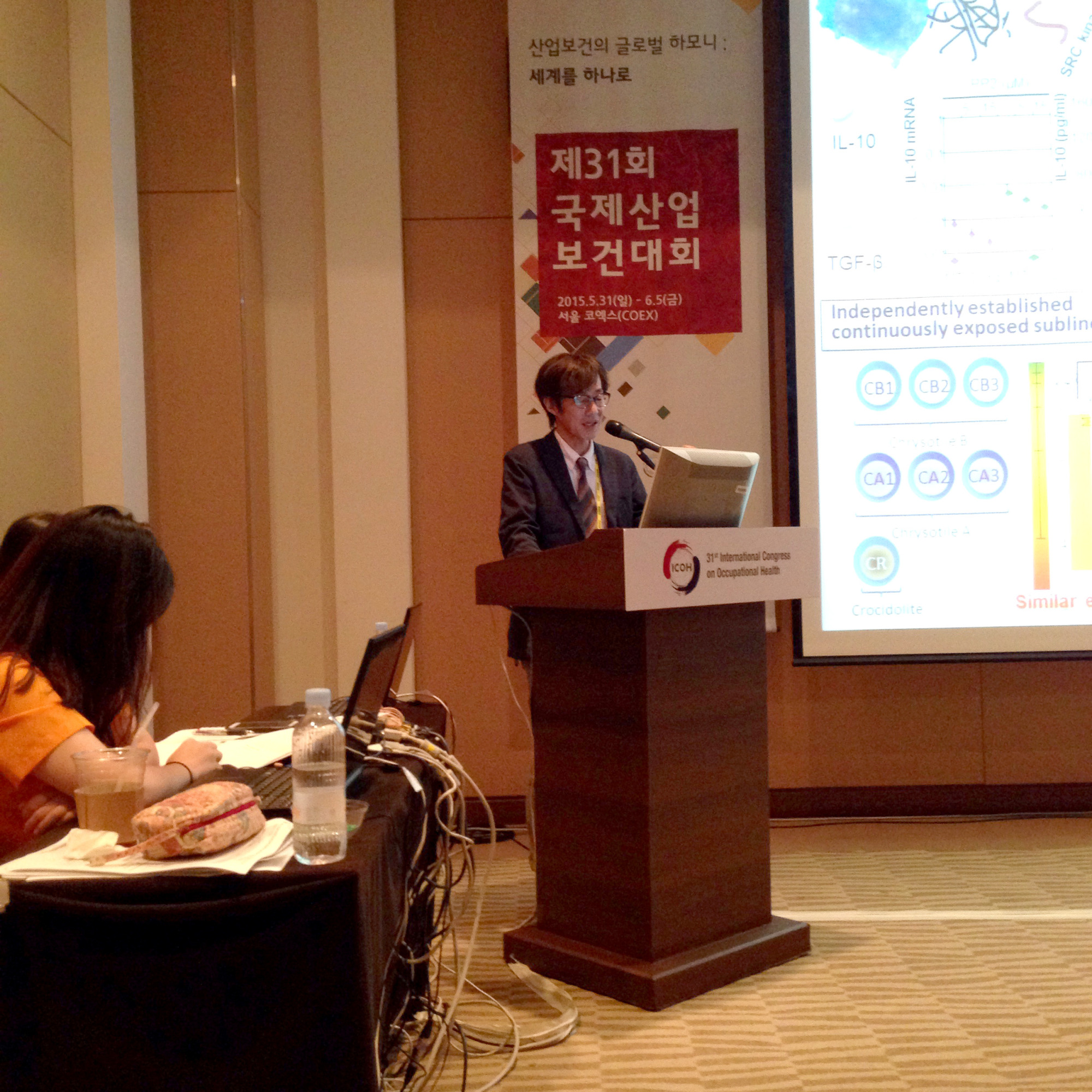 ポスター会場は展示上も兼ねていて,ソウルあるいは韓国の観光局のブースでは,チマチョゴリの女性がいらっしゃいました。そして会場内の消火器と自動販売機で買った「いろはす」かな・・。そして,午後の