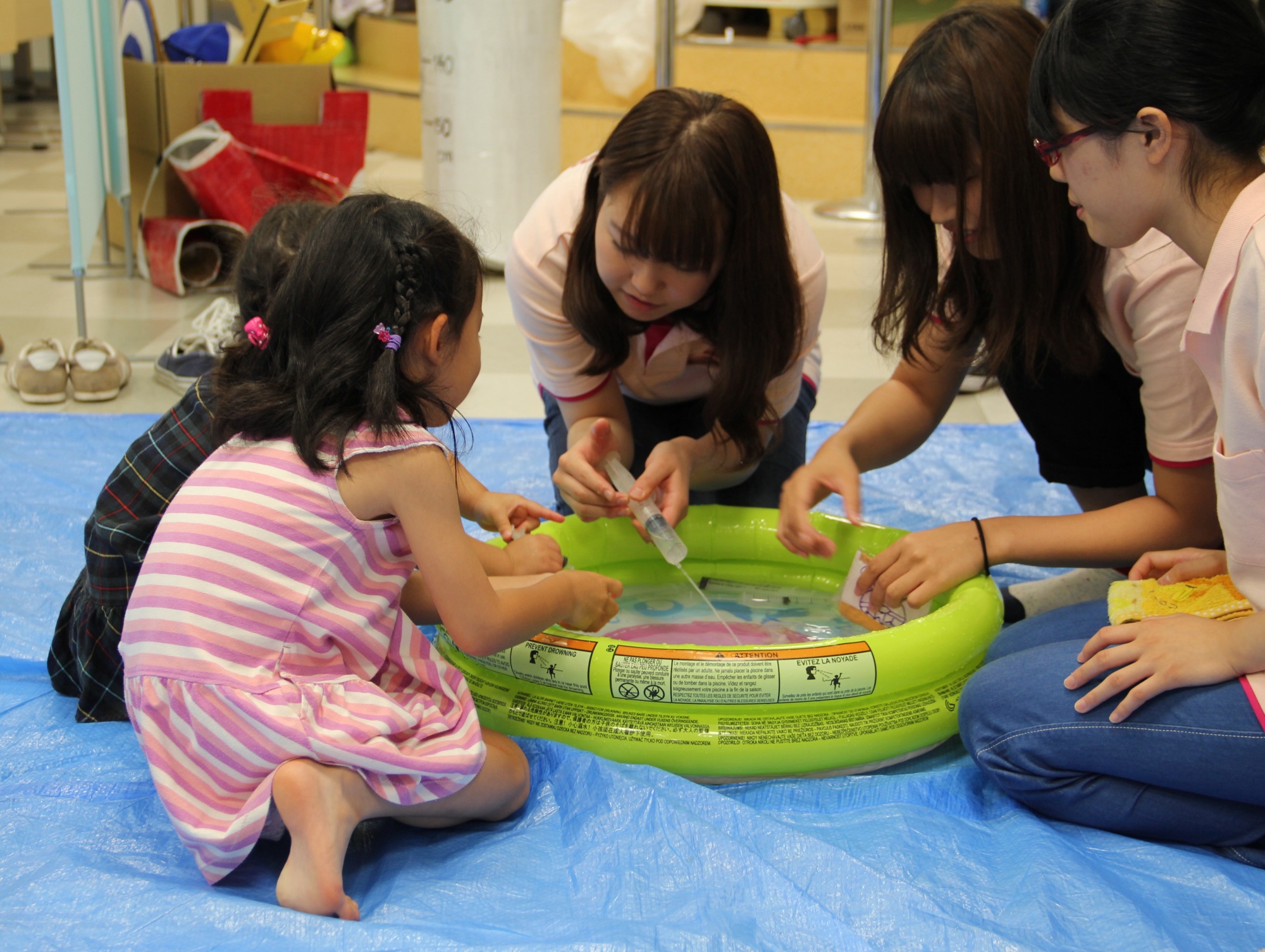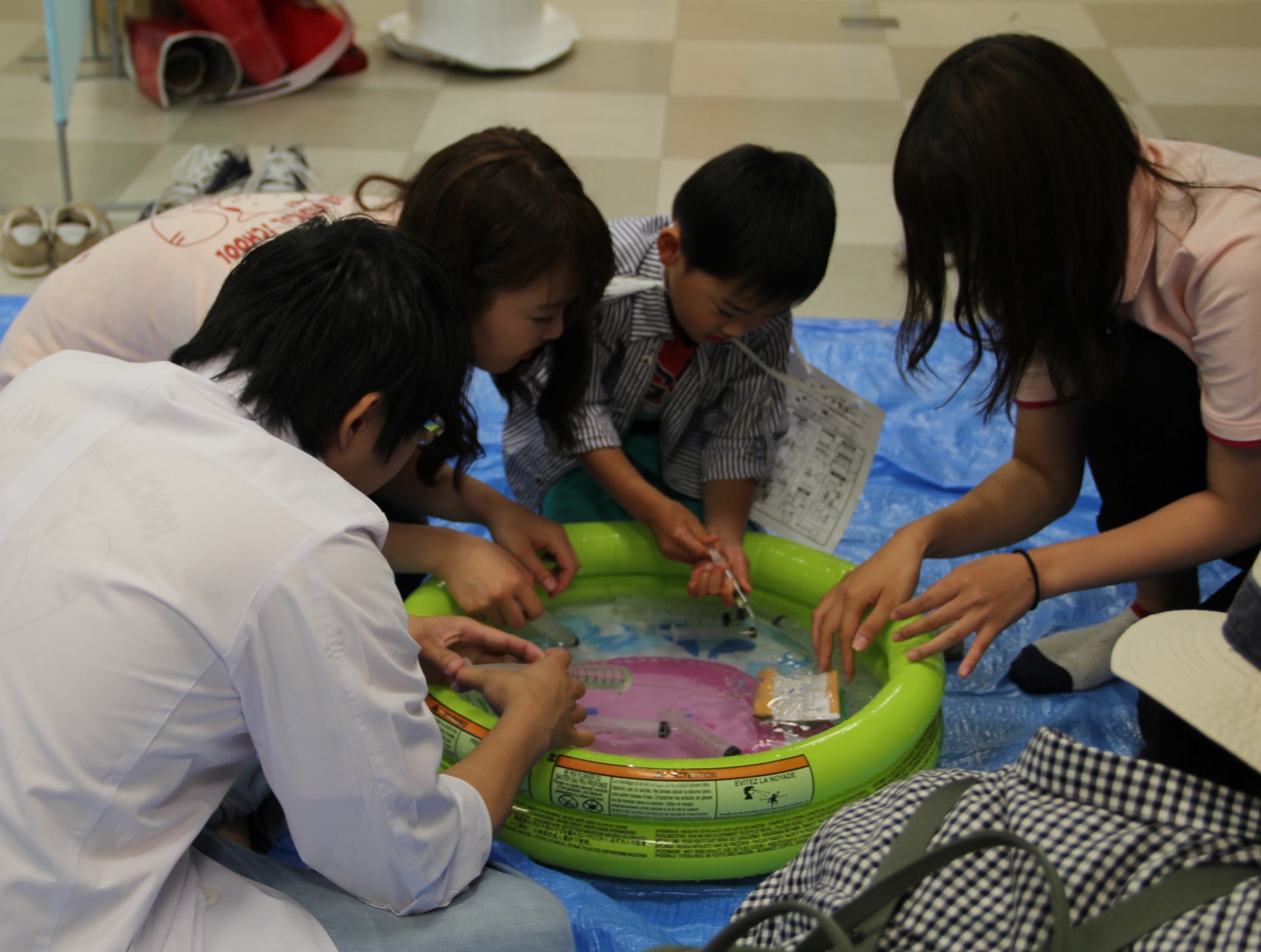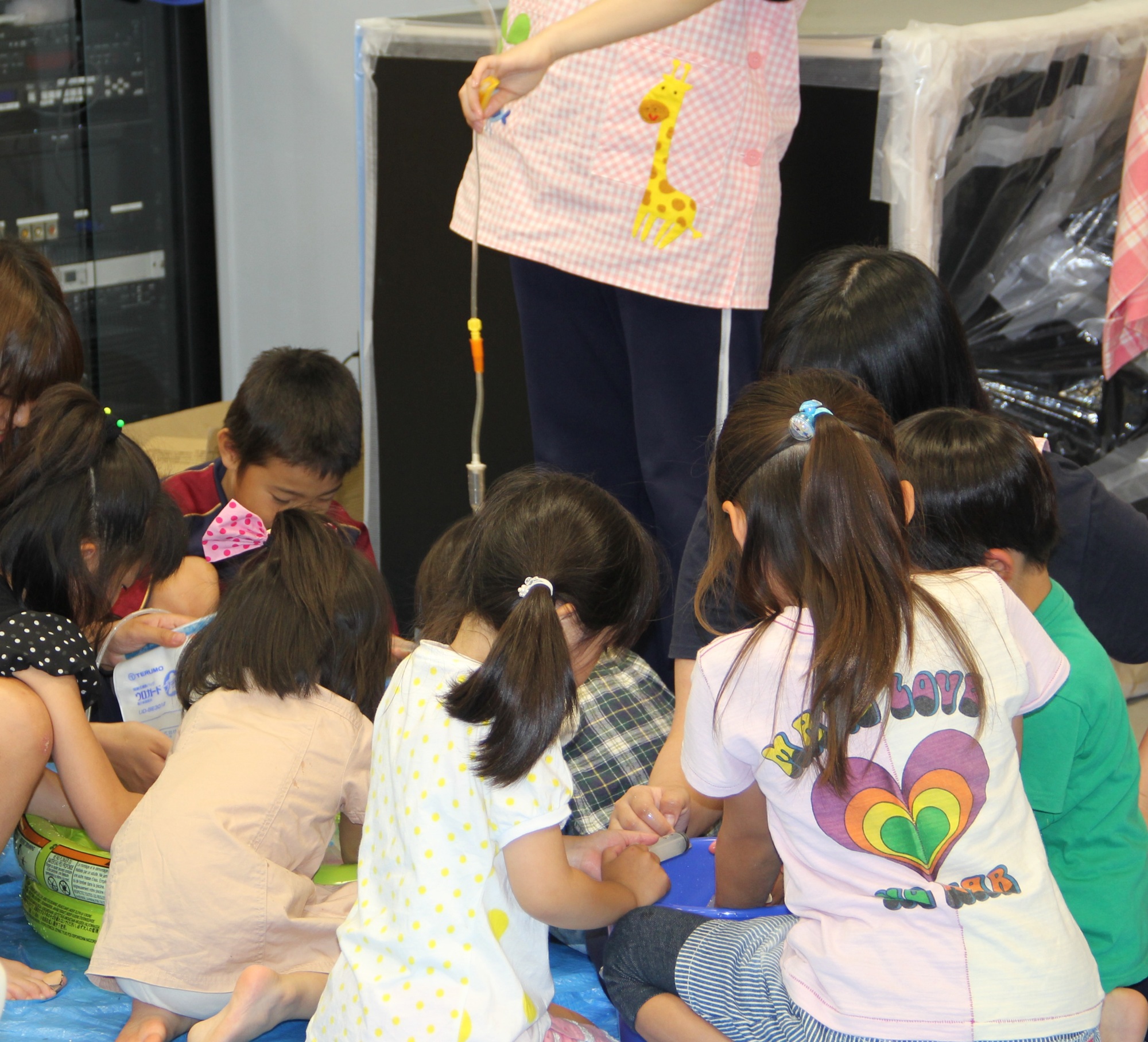体パズルや,聴診器・打腱器で体に触れてみたり,注射器や点滴セットでの水遊び!