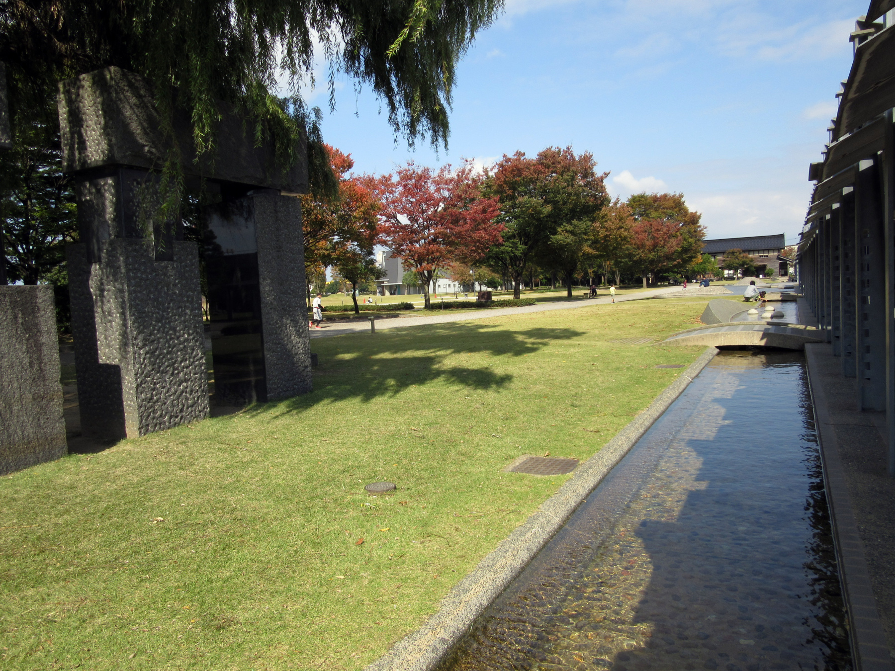 そして,鞍月用水【いつも多くの人でにぎわう香林坊を流れているこの用水は、1600年代の初め頃に、お城を囲む堀(ほり)としての役割も果たせるようにつくられました。】沿いに駅前まで。