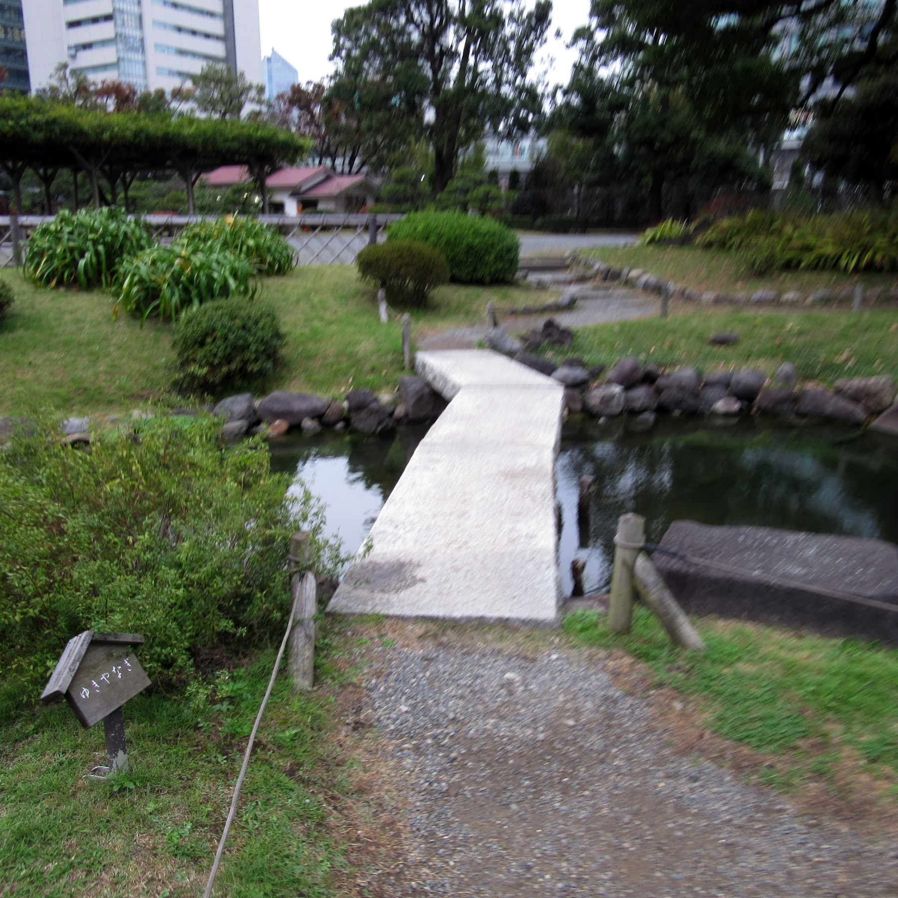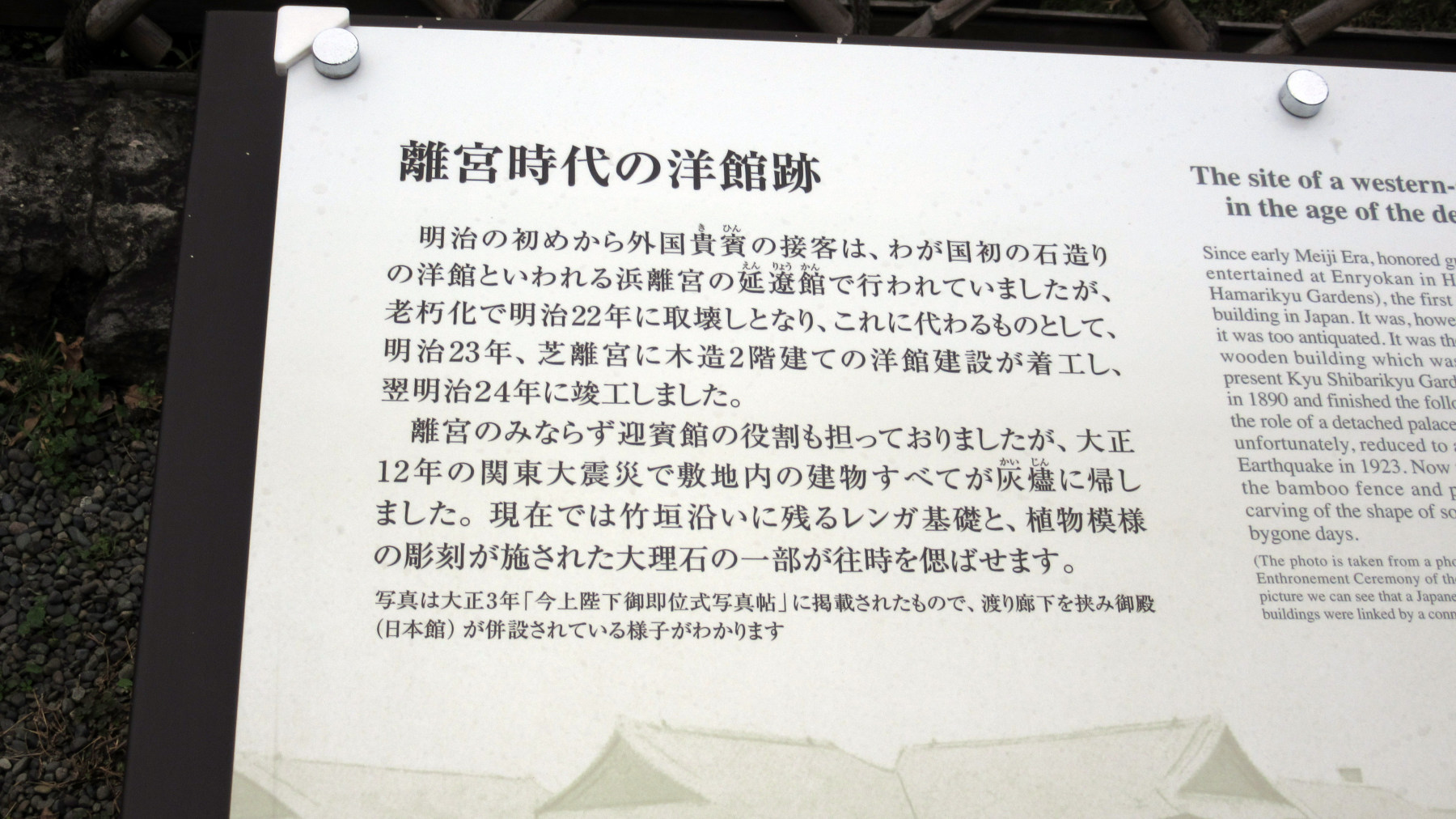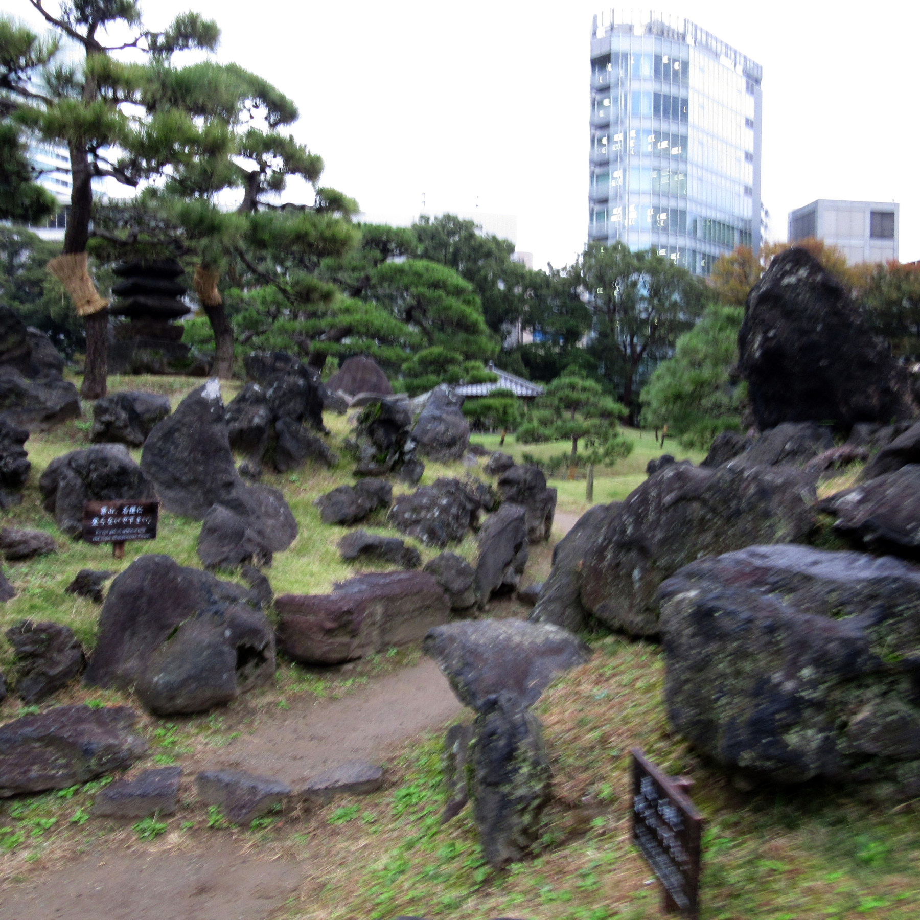 【旧芝離宮恩賜庭園は江戸幕府の老中・大久保忠朝の上屋敷内に作庭した大名庭園楽寿園を起源とする回遊式庭園である。作庭当時は海岸に面しており、浜離宮恩賜庭園同様汐入の庭であった。現在では周囲の埋め立てとビル群により海の眺望は失われた。一部が鉄道の増設用地に提供され面積が狭くなった。】です。