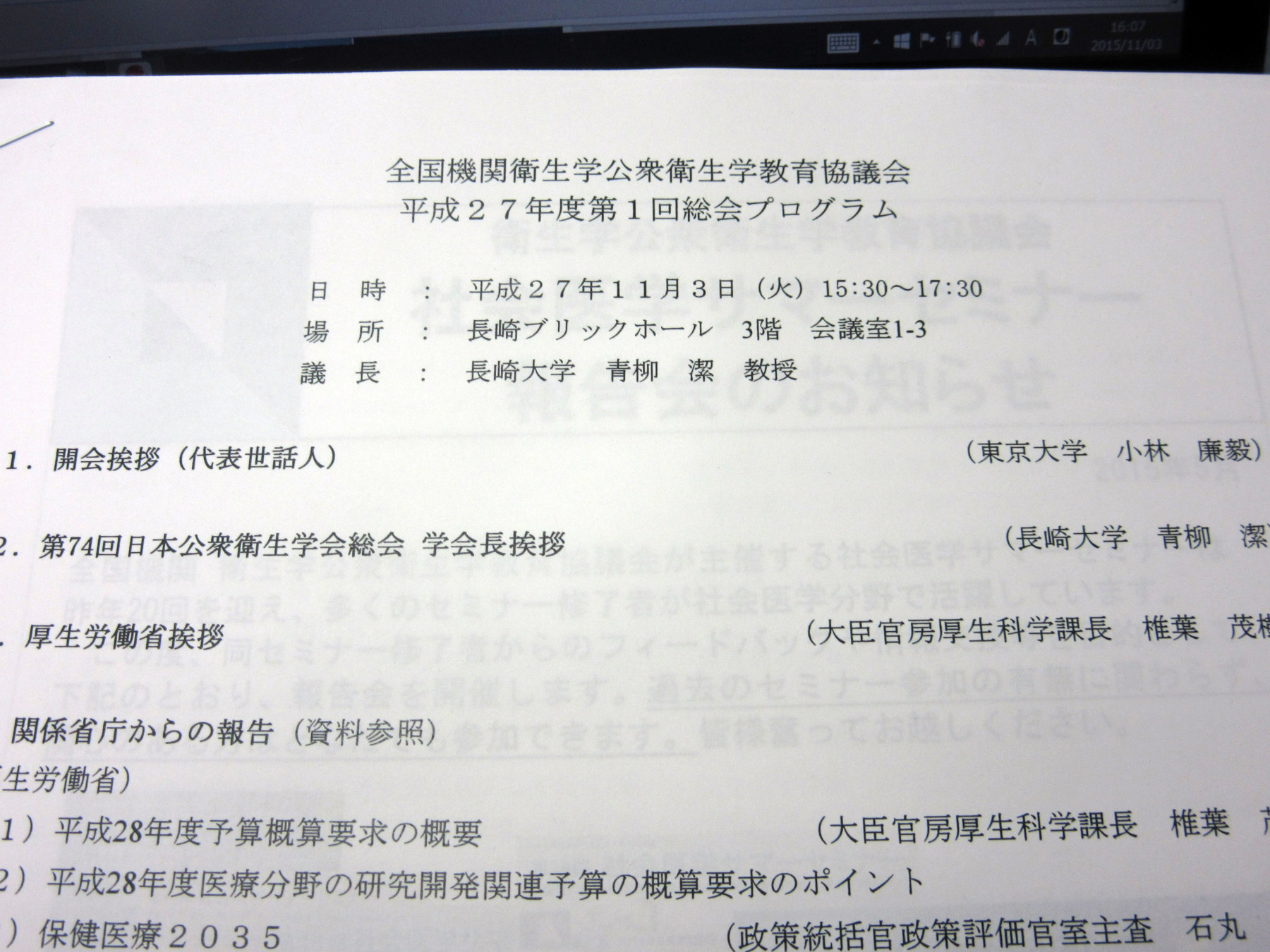 日本公衆衛生学会は会員ですが,総会には1回しか参加したこともなく・・・今回も日本衛生学会理事会にのみ,です。ただ,大槻は機関誌スピンオフ企画のeBookの件,学会賞専攻委員会の報告,社会医学系の専門医制度の進捗状況の報告,そして機関誌発行に関連する諸問題の解決とともに経費削減とOpen