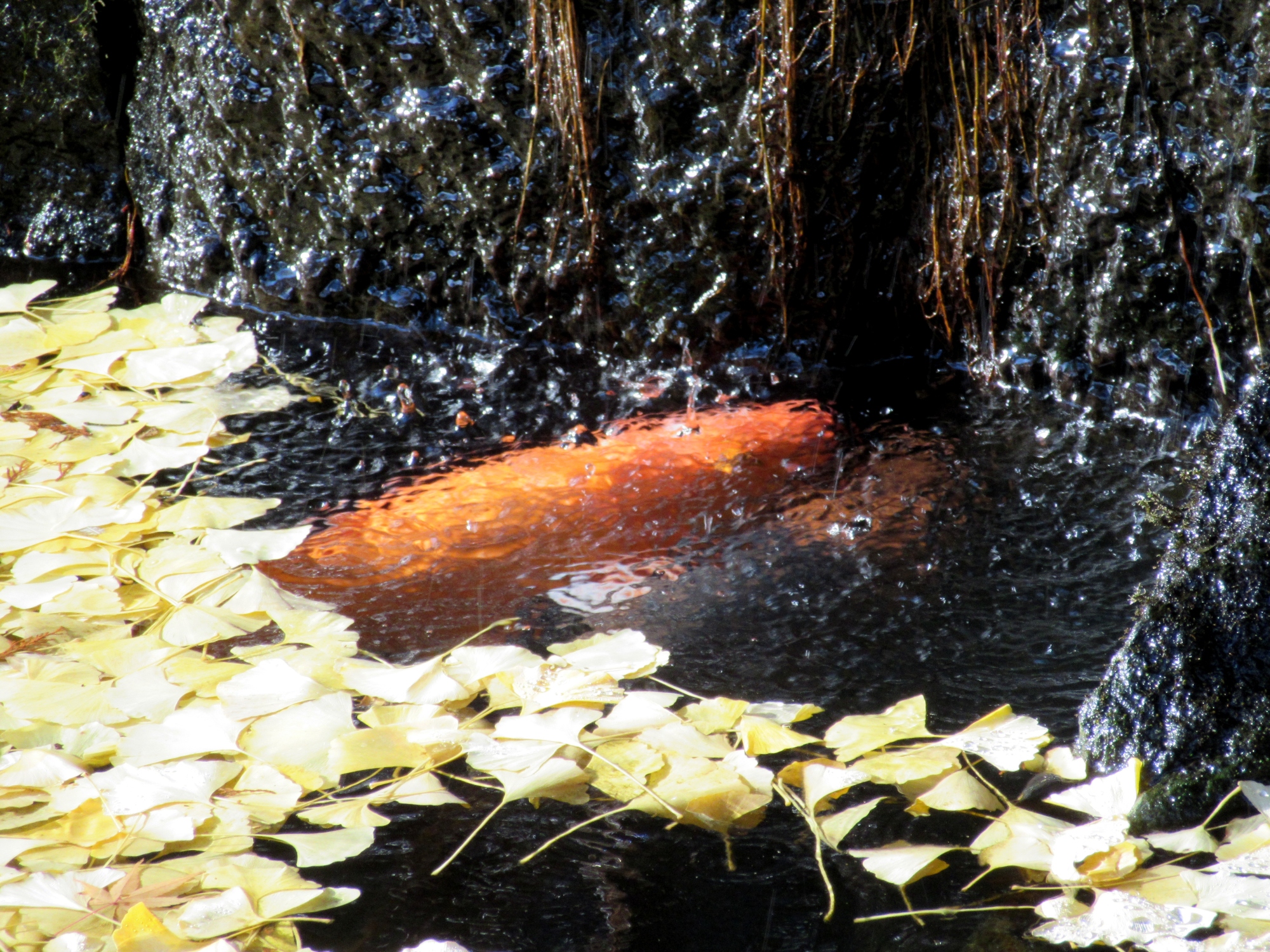 銀杏の落ち葉は境内の池の水面を埋め尽くしています。