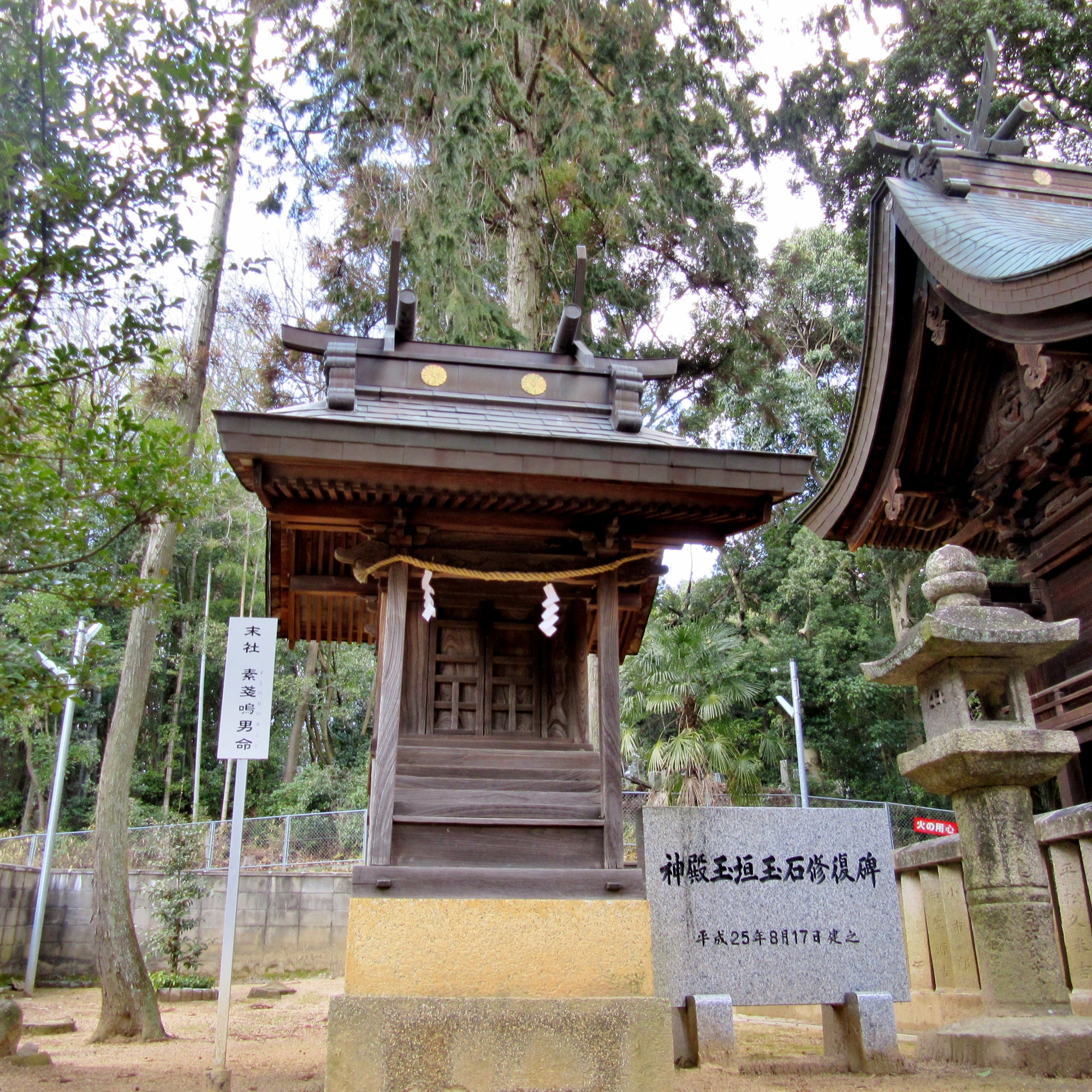 神社入り口の説明板には五十猛命を「いそたけ」とふりがながある。玉野市広岡の五十猛神社も同じよみであり、 この神社からの勧請かもしれない。吉備と出雲とは行き来が多く、出雲の五十猛命は「いそたけ」とよまれる事が多いので、出雲系の五十猛命を勧請したのであろう。】とのことです。