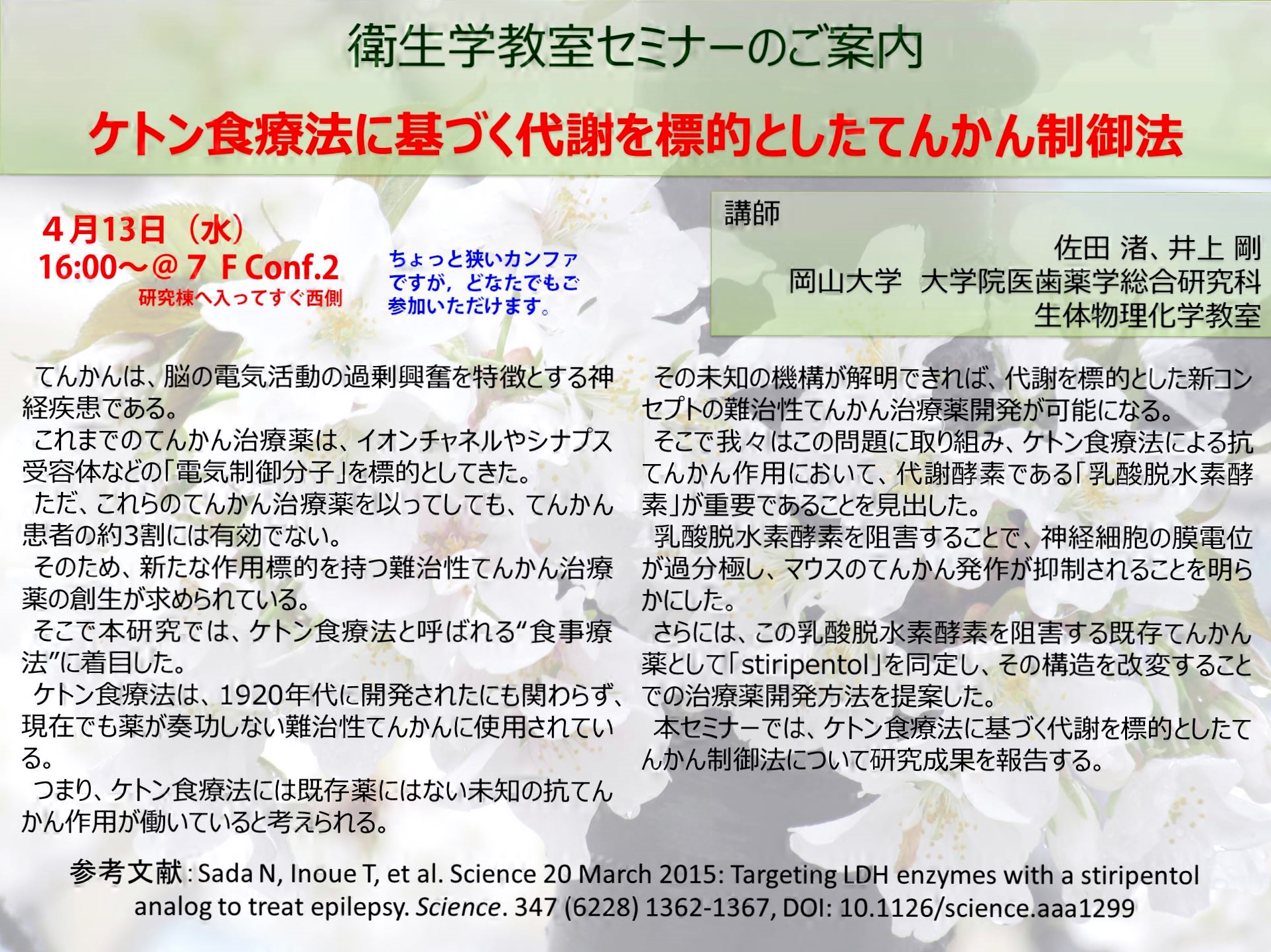 衛生学プレゼンツのセミナーで「ケトン食療法に基づく代謝を標的としたてんかん制御法」と題して,岡山大学薬学の佐田先生(+井上先生)をお招きして,講演をしていただきました。