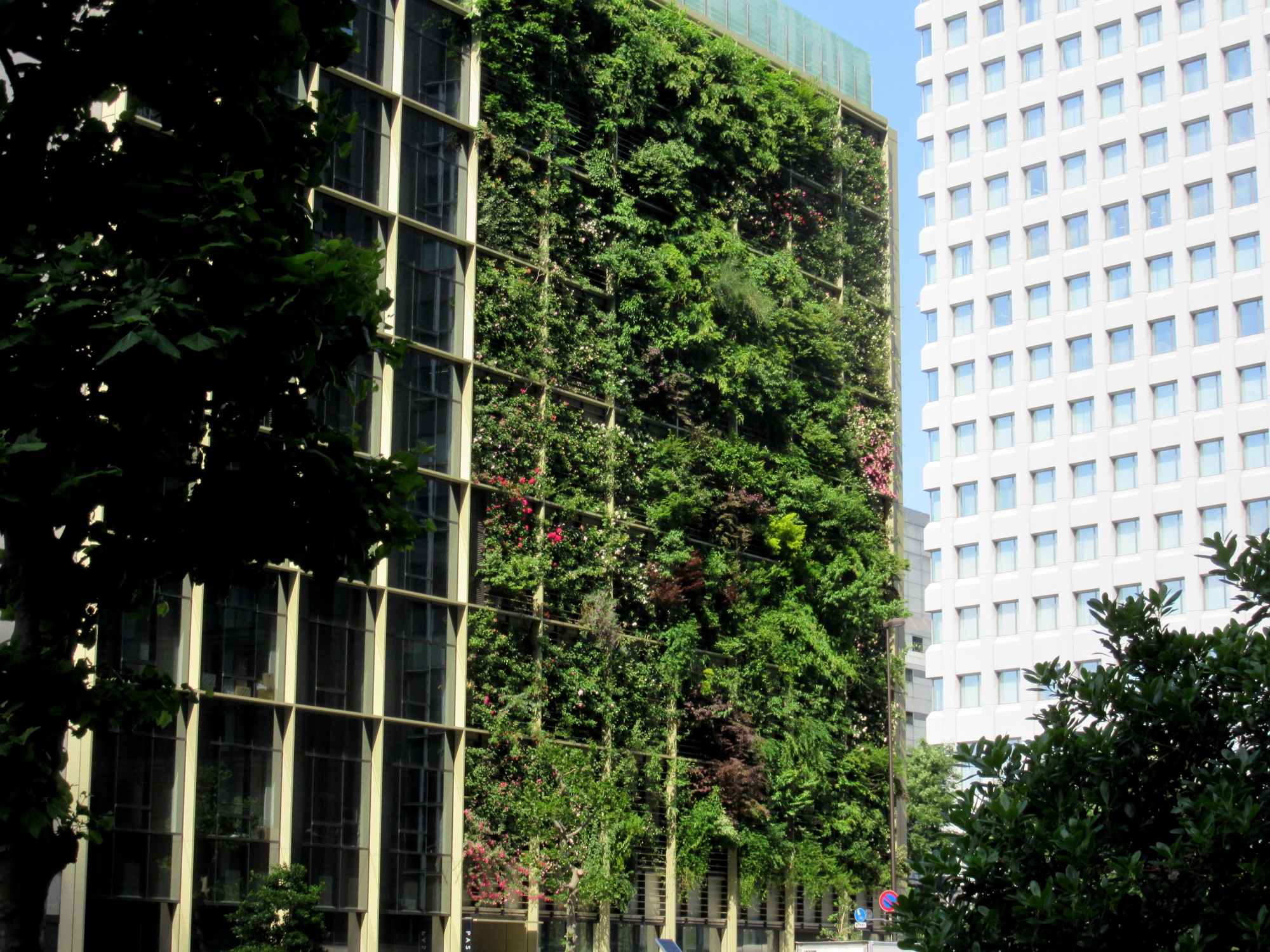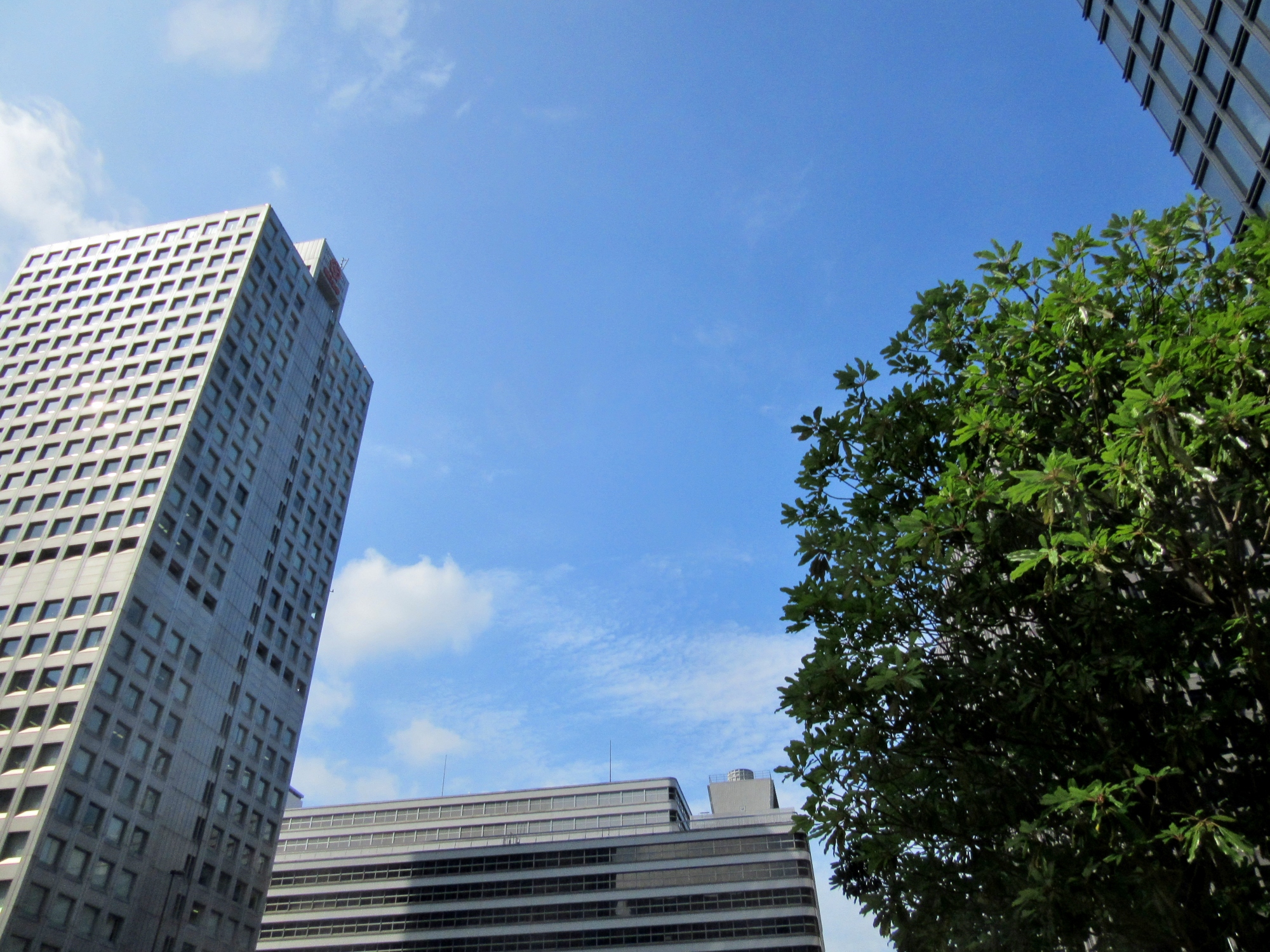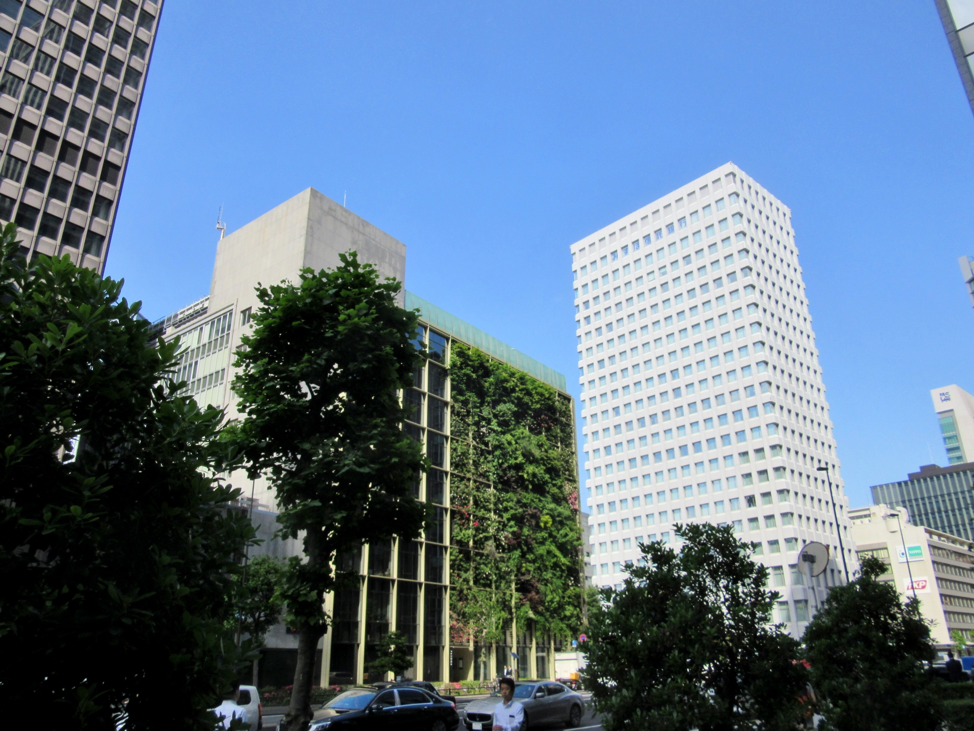 日本橋口から外へ・・青空ですね,そしてビルの壁面の緑もいいです。