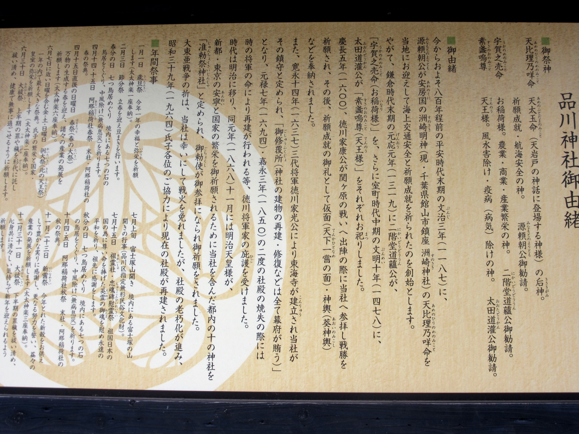 【文治3年(1187年)、源頼朝が安房国の洲崎神社から、海上交通安全と、祈願成就の守護神として、安房国の洲崎明神である天比理乃咩命を勧請して祀り、品川大明神と称したのに始まると伝えられる。】