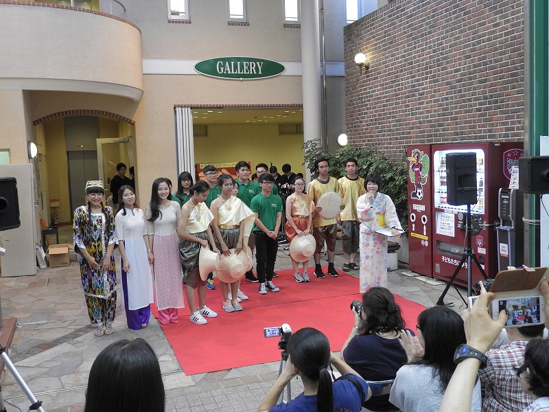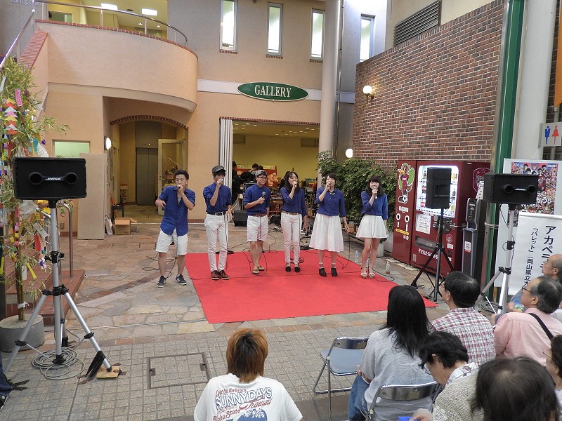 理大さんと商大さんは,アーケード内の出展ブースの紹介,そして就実大さんのけん玉,清心女子+岡大のアカペラグループ「ビリペル」,さらに環太平洋さんの民族衣装+民族舞踏