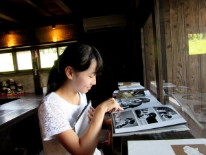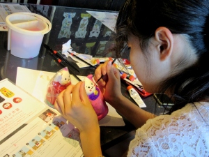 娘は絵付け体験をしました,そして二人で御札も書いて貼りました。