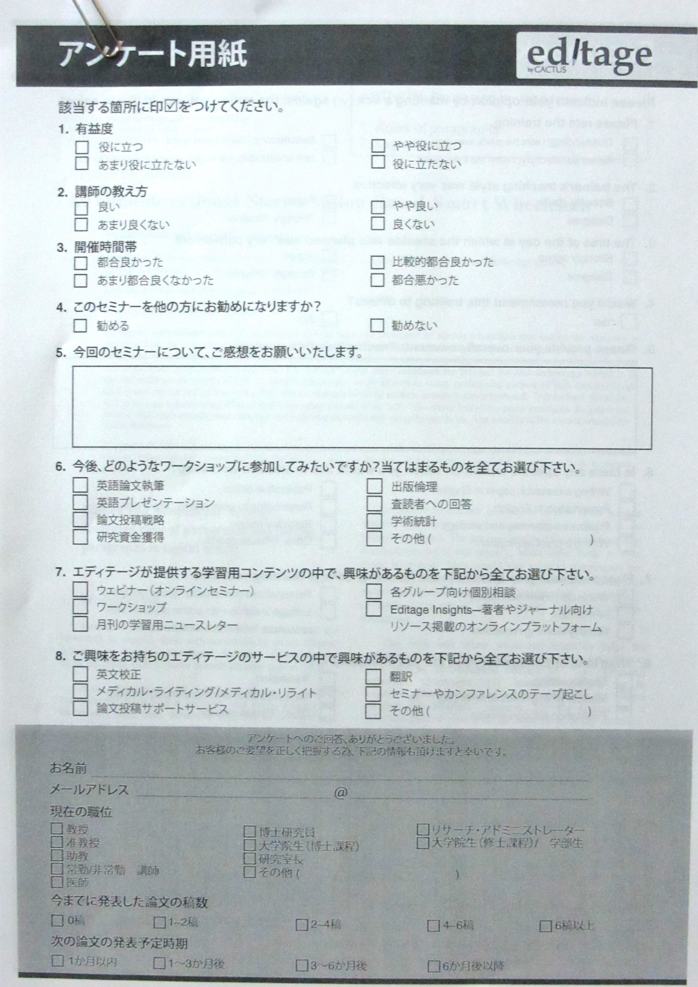 終了時には,Editageから頂戴した冊子の配布・・そしてアンケートも集まってきております。本当に,想定以上に盛会裏に終了できましたし,学内で,こういったセミナーへの渇望が強いことも認識できました。これからも川崎医学会として,学内の研究の推進につながるイベントなどを考えて行きましょう!