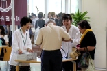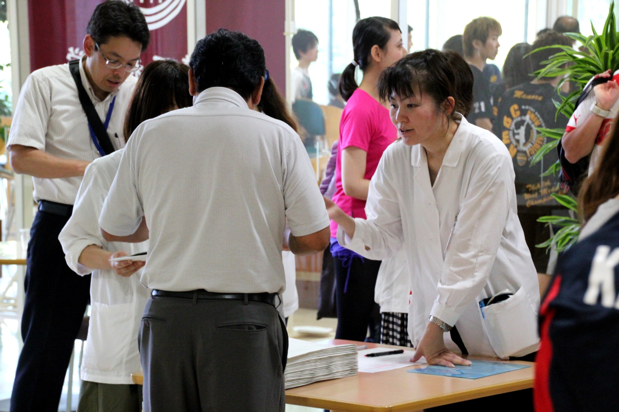 実は,西医体の壮行会をしているラウンジの横の教室での開催で・・受付の間の背景は,壮行会です。
